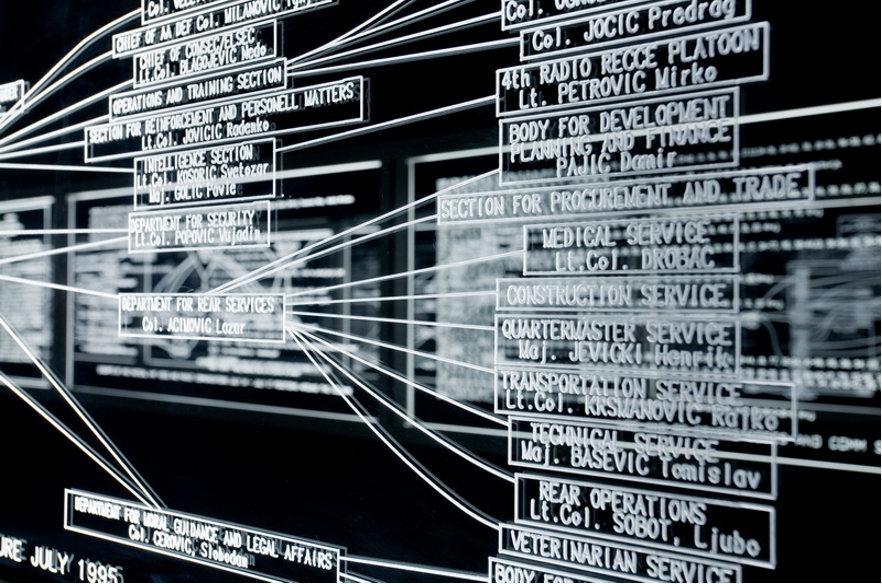 In de laatste ruimte is het obscuur donker. In gestructureerde rijen hangen lichtgevende panelen met een hele reeks handgeschreven notities, diagrammen en territoriale schema’s. Er heerst een onheilspellende, gespannen en opgesloten sfeer die wordt versterkt door audio-opnames. Marko Peljhan volgde in de jaren negentig de telecommunicatie van Servische militaire strijdkrachten. De opgenomen informatie zette hij om in notities en kaarten gemaakt met forensische software en algoritmen. Allereerst is Territory 1995 (2009-2010)een abstract geheel waarvan ik probeer te ontcijferen wat ik lees en zie. Pas later besef ik dat de details abstract blijven en dat het juist het strategische geweld is dat hier zichtbaar wordt. De manier waarop deze genocide tot in de kleinste details werd doordacht wordt hier zichtbaar en wordt daarmee bewijsmateriaal van een nog steeds door veel Bosnische Serviërs ontkende genocide.