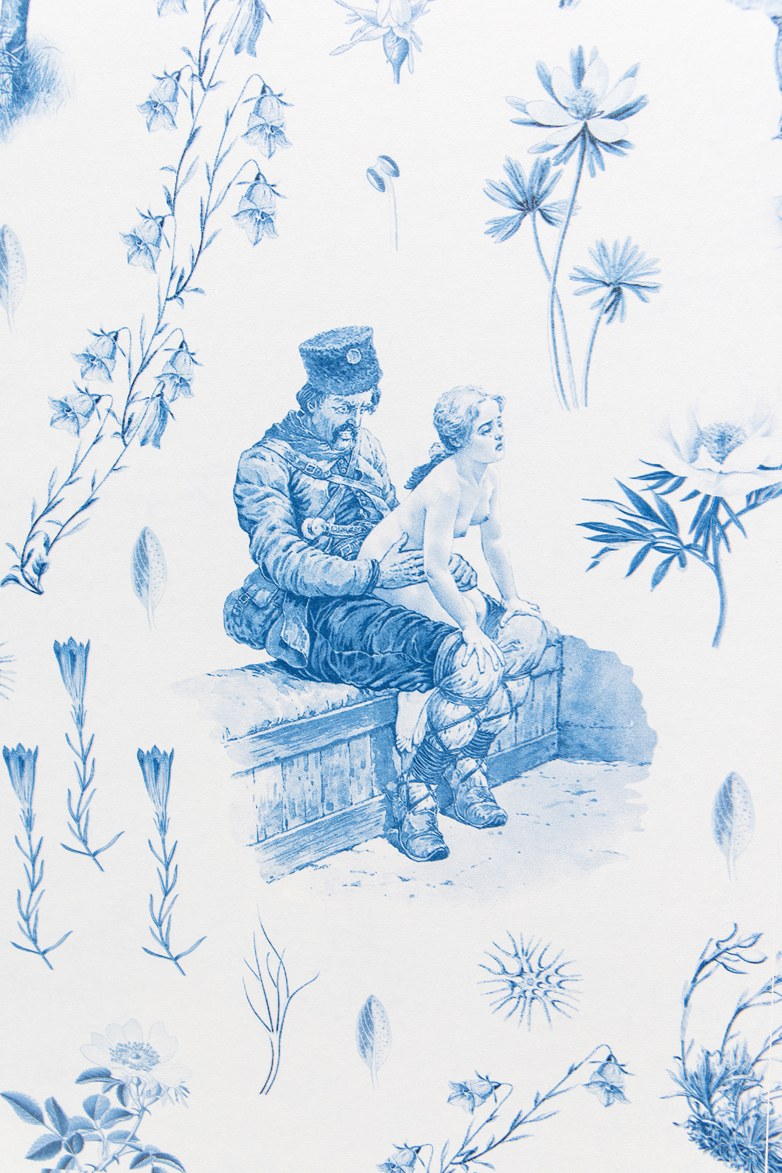 In de andere helft van de halfronde kamer meen ik vanaf een afstand een teder, ouderwets, Engels behang te herkennen. De ronde muur naderend ontdek ik weliswaar mooie bloemmotieven maar ook verfijnde lijntekeningen van een andere aard. Met de muurinstallatie Balkangreuel (2019) belicht Lana Čmajčanin tekeningen die onder de Oostenrijks-Hongaarse elite als oorlogspropaganda werden gebruikt. Gottfried Sieben maakte deze tekeningen in 1909, een jaar nadat Bosnië en Herzegovina door Oostenrijk-Hongarije waren geannexeerd. Militairen in uniform uit de Balkan werden pornografisch en als barbaarse verkrachter afgebeeld. Het werk geeft een schrikbarende inkijk in welke ideeën er waren over of werden gecreëerd over mensen in de Balkan.