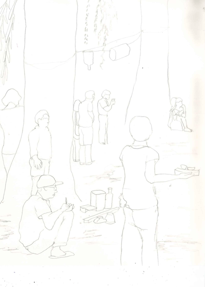 Voor Nakajima is het zoeken naar muziek zonder genre een oneindige tocht. Door het gebruik van vreemde objecten waar ze zelf ook niet altijd de functie van weet, tast ze de grenzen van de muziek af. Zo probeert ze tijdens de performance langzaam en vol concentratie knikkers te laten rollen door een niet te definieren metalen object, het veroorzaakt galmende geluiden. Het blijkt een voorwerp te zijn wat ze meenam uit de keuken van haar tante, in haar moederland Japan. Met zelfontdekte klanken en tonen maakt ze haar eigen akoestische producties, ze sluiten moeiteloos aan op het werk van Berthet die als slagwerker afstudeerde aan het conservatorium van Brussel. Sindsdien maakt hij zowel binnen als buiten experimentele muziekinstallaties waarin het experiment van het druppelen van water op diverse oppervlakten meervoudig centraal staat. Gedurende de performance in de botanische tuin heeft niet alleen de menselijke aanwezigheid van de kunstenaars invloed op de installatie, ook zijn zij in dialoog met de natuurlijke elementen in hun omgeving: water en wind.