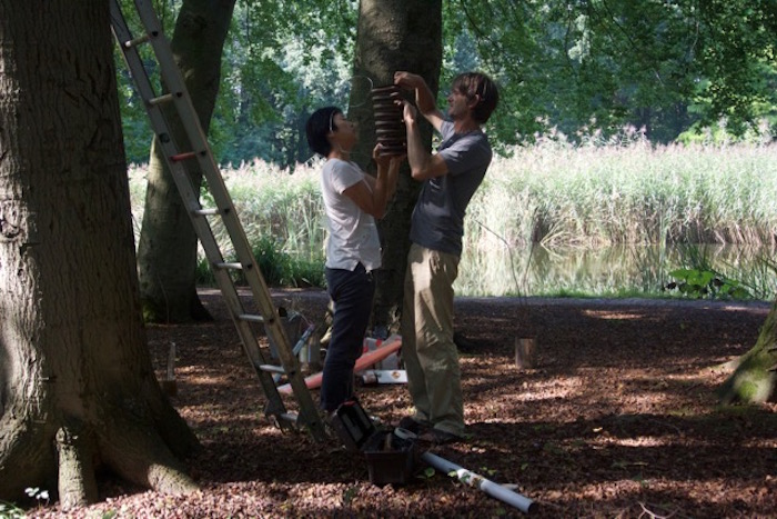 De Japanse installatie kunstenares Rie Nakajima, overgevlogen uit Londen, heeft niet alleen muzikant Pierre Berthet uit België meegenomen naar Nederland, maar ook een auto volgeladen met diverse zelf gefabriceerde muziekinstrumenten. Ze zijn in de vorm van een installatie verspreid en opgebouwd in een botanische tuin. PVC buizen waar bont gekleurde verjaardagsballonnen overheen zijn gespannen dienen als trommels. Aan de bomen hangen waterreservoirs gemaakt van plastic flesjes die langzaam waterdruppels op de gespannen ballonnen doen vallen. Rietjes van een meter lang die door hun neon kleuren oplichten in de schemering maken fluitende klanken. De performance van Nakajima en Berthet is één groot levend experiment.
