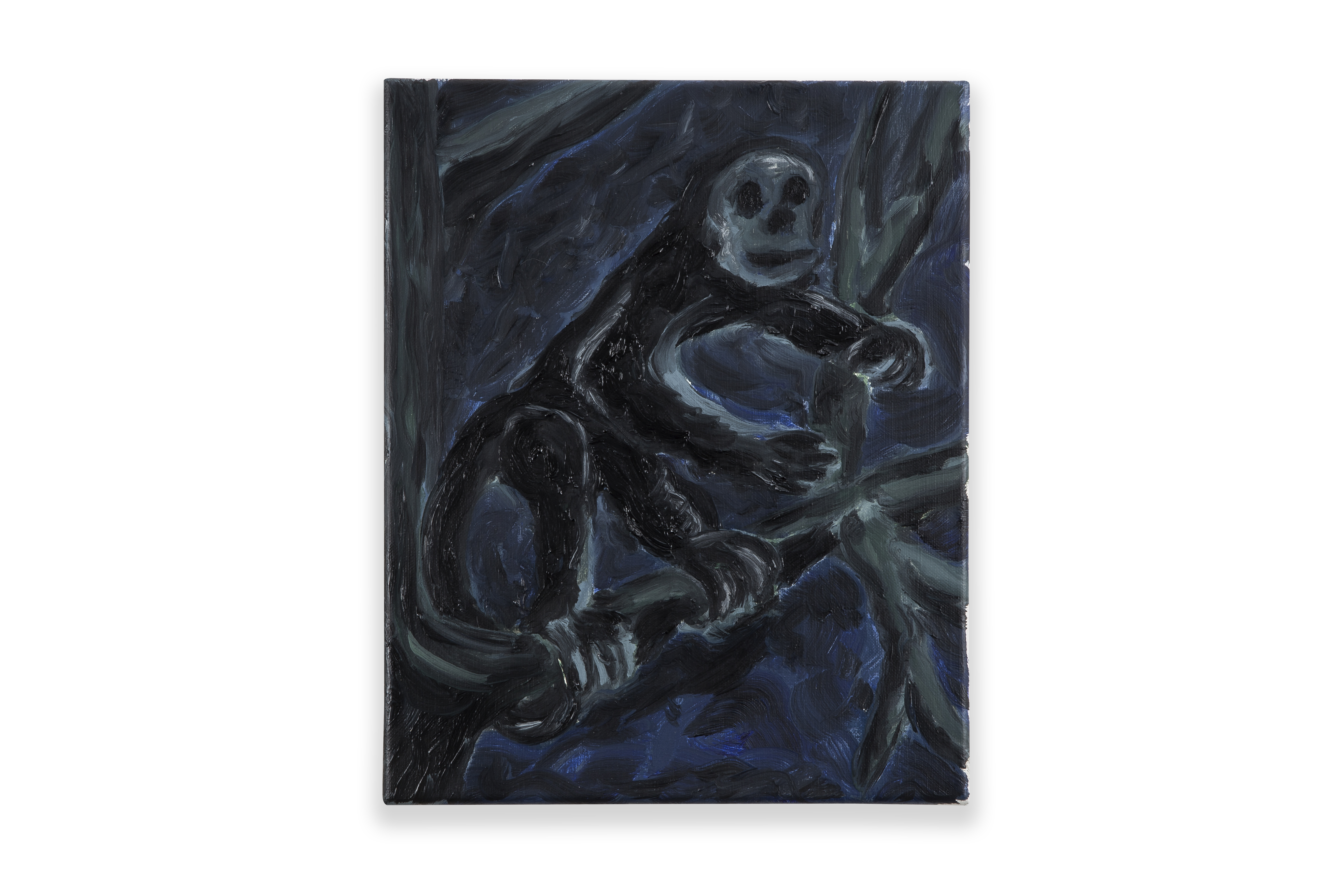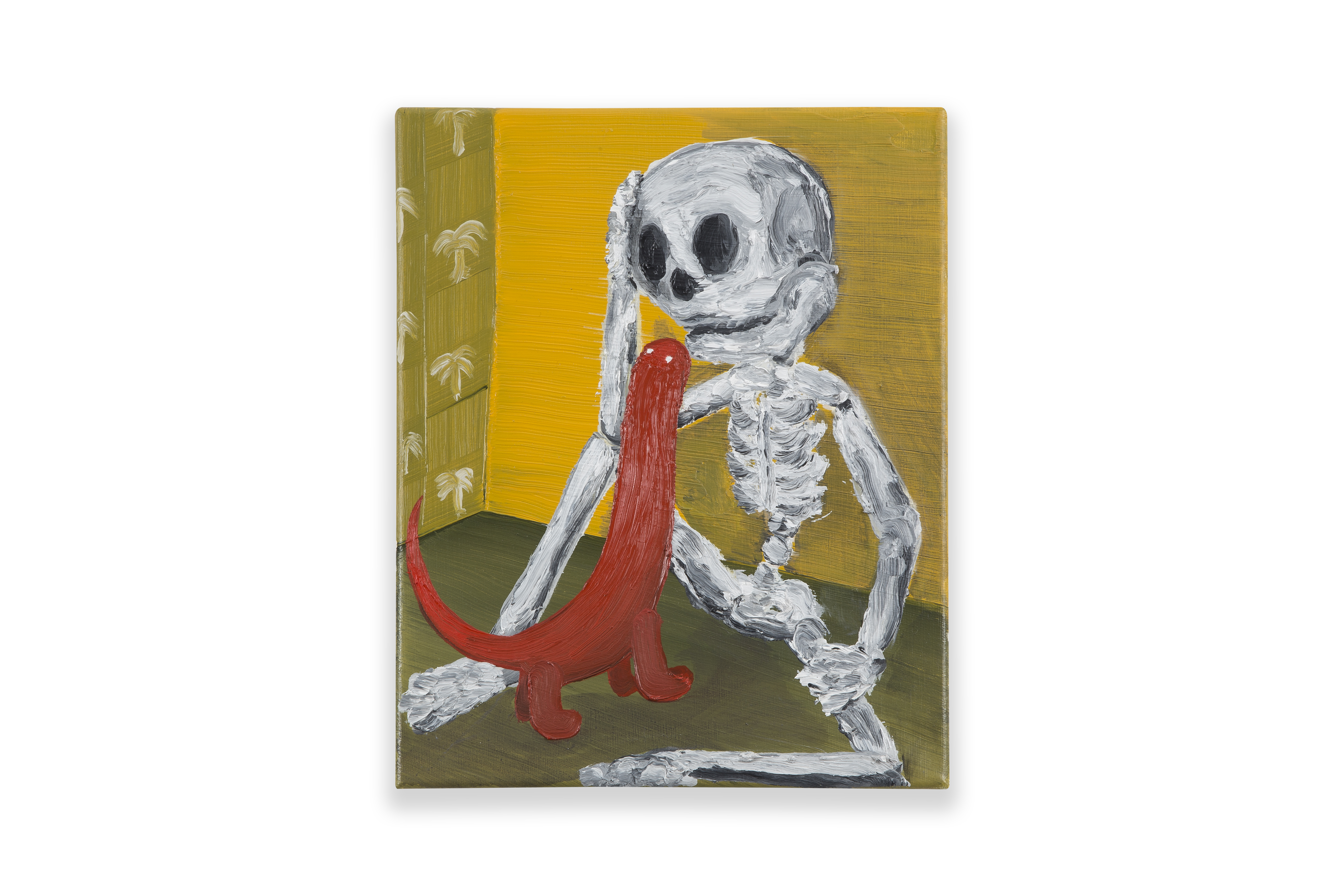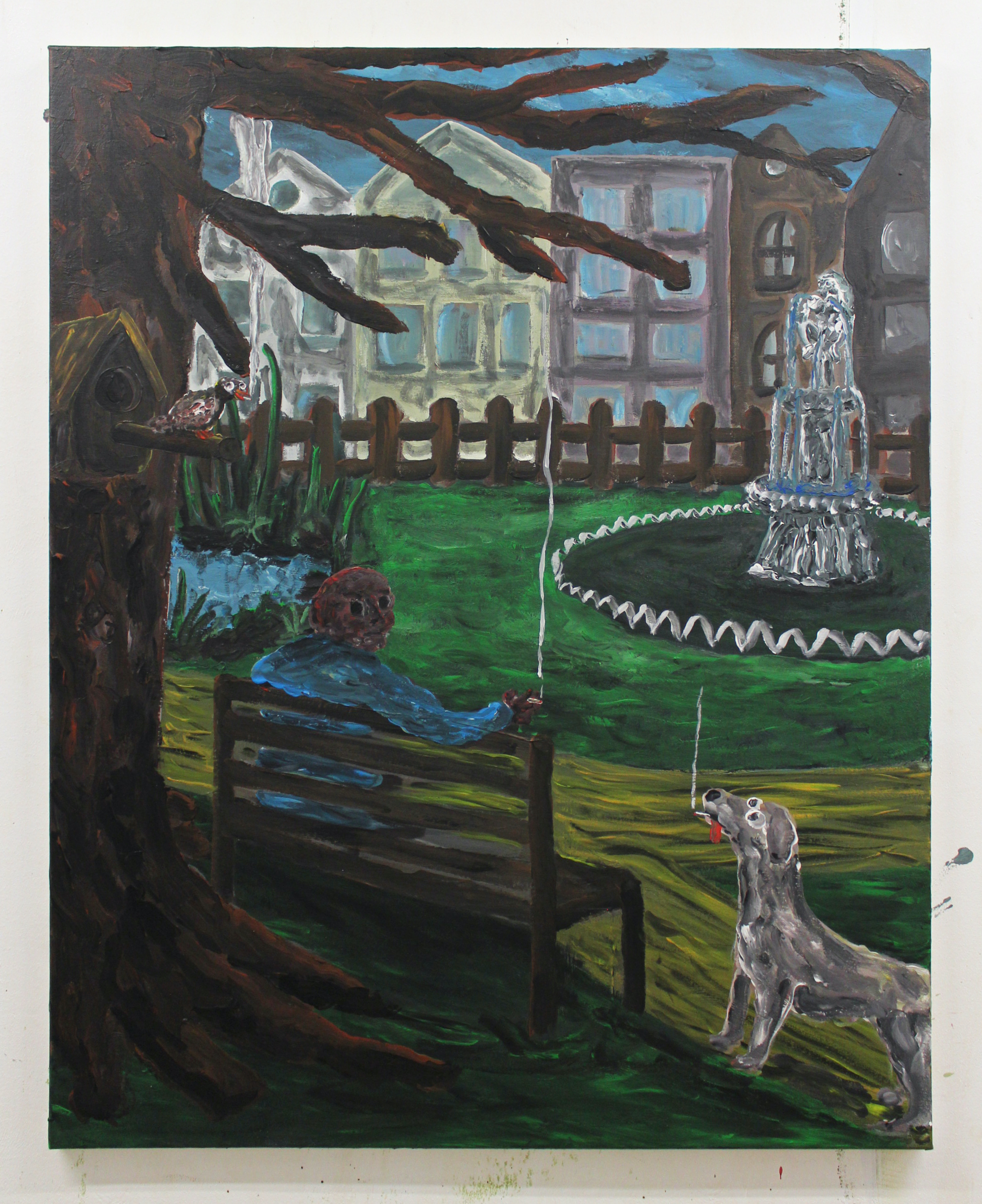 De smorende opa in het park is inmiddels nostalgie. Dankzij rookvrije zones en assertieve niet-rokers, die uiteraard het gelijk aan hun zijde hebben, wordt de roker verbannen uit de publieke ruimte. In de beslotenheid van zijn eigen huis doet hij echter precies waar hij zelf zin in heeft. Oost west, thuis best lijkt de boodschap in het schilderij Domestic Animal. We zien de kater van de kunstenaar die gewillig poseert voor zijn meester. Hij kijkt de toeschouwer uitdagend aan met gekrulde staart en gestrekte pootjes. ‘Wie doet me wat’ lijkt hij te willen zeggen. Zijn zwarte kattenlippen krullen van plezier omhoog, want daartussen zit een sjekkie dat het dier met veel smaak oprookt. Het leven is kort, laat ieder toch zijn pleziertje, lijkt de boodschap van de kater, de hond en het dampende aardappelmannetje in het park.
