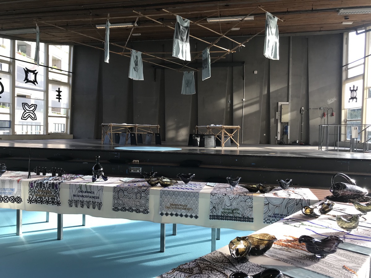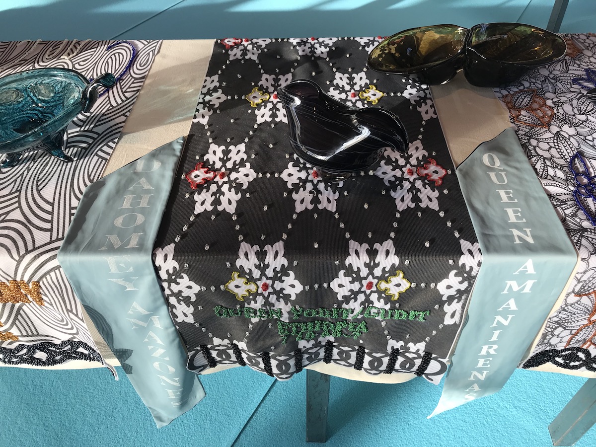 ‘Guess Who’s Coming to Dinner Too?’ is te zien als een correctie op de geschiedenis en een hommage aan of een vervolg op het iconische werk ‘The Dinner Party’ 1979 van Judy Chicago, een driehoekige tafel gedekt voor 39 vrouwen dat de bijdrage van vrouwen aan de westerse geschiedenis zichtbaar maakt. In de witte mannenwereld van 1979 was dat een heroïsche daad waarvoor (vrouwelijke) bezoekers uren in de rij stonden maar evengoed riep het veel weerstand op. Nu, veertig jaar later, laat Kaersenhout ons zien dat het werk z’n beperkingen kende: zij nodigt 38 zwarte vrouwen en vrouwen van kleur uit aan de tafel. Ze vertelt in een bijbehorend boek de verhalen van deze heldinnen van verzet. Opnieuw een bijstelling op de geschiedenis.