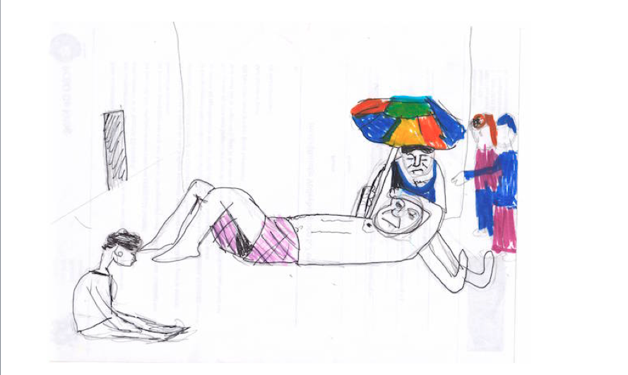 Het werk van Ron Mueck werd toevallig door een jongen en een meisje met dezelfde naam uitgekozen. Hun namen mogen dan wel hetzelfde zijn, maar hun tekenstijlen verschillen duidelijk van elkaar. Daarnaast had de ene Finn geloof ik niet helemaal door dat de kleine mensen toeschouwers zijn en de grote het kunstwerk, maar dat mag de pret niet drukken.