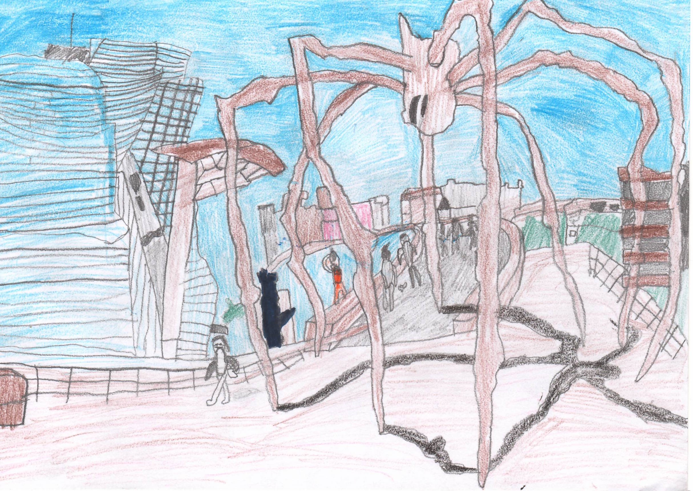 Miquel vond het heel leuk dat Louise Bourgeois een reuze grote spin heeft gemaakt. Hij vond het wel een beetje gek dat zij dit kunstwerk maakte voor haar moeder, want de meeste moeders houden helemaal niet van spinnen. Miquel heeft heel hard gewerkt aan de tekening, ik viel bijna steil achterover toen ik het resultaat zag. Wat een held!