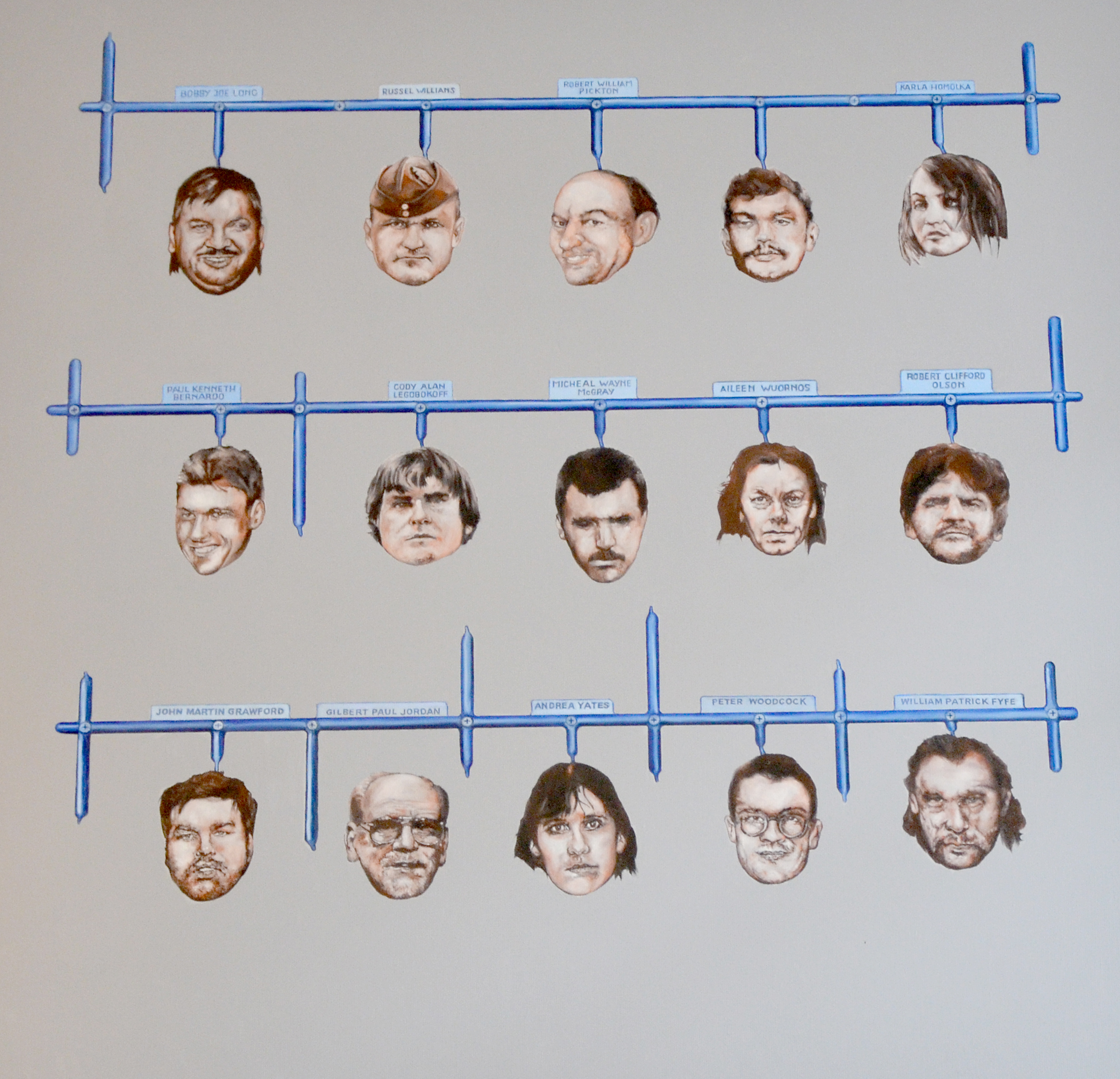 Vijftien geschilderde gezichten kijken grauw en kleurloos de galerie naar binnen. Deze twaalf mannen en drie vrouwen hebben stuk voor stuk minstens tien mensen vermoord. De achtergrond is lichtgrijs en boven de hoofden hangen naambordjes. Ze komen uit Canada, het land met procentueel gezien de meeste seriemoordenaars. Dit was voor kunstenaar Aldert Mantje genoeg rede om hun gezichten te schilderen, hangend aan ijzeren buizen.