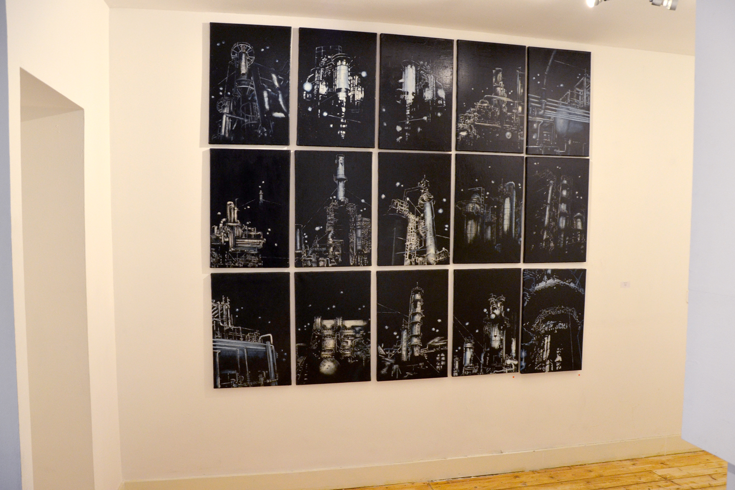 Achterin de galerie aan de wit geschilderde wand hangen vijftien doeken van Menno Schenk. Donkere schilderijen met daarop gebouwen die uit de tijd van het communisme en de DDR lijken te stammen. Het zijn grijze fabrieken met stalen details die glinsteren in de donkere nacht. De toeschouwer kijkt schuin van onder tegen de gebouwen aan, de geschilderde fabrieken lijken hierdoor groter en imposanter. Deze doeken zijn de aanzet geweest voor het thema optimisme en Schenk zette met deze werken de toon van de groepsexpositie. De toon van de weemoed naar vroeger en het idee dat onze tijd niet meer optimistisch te benaderen valt.