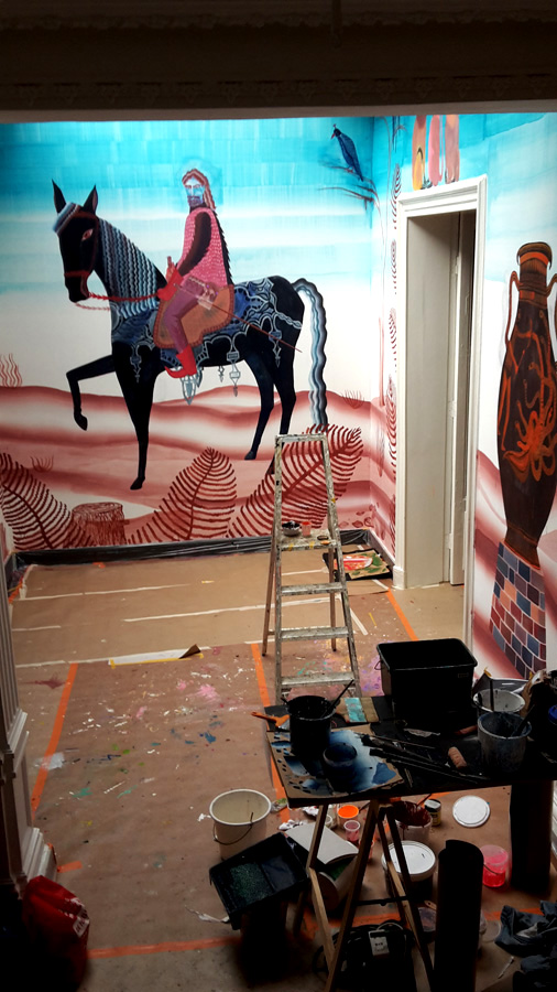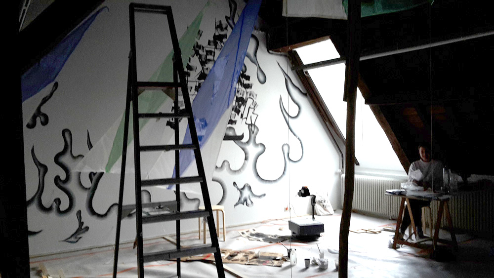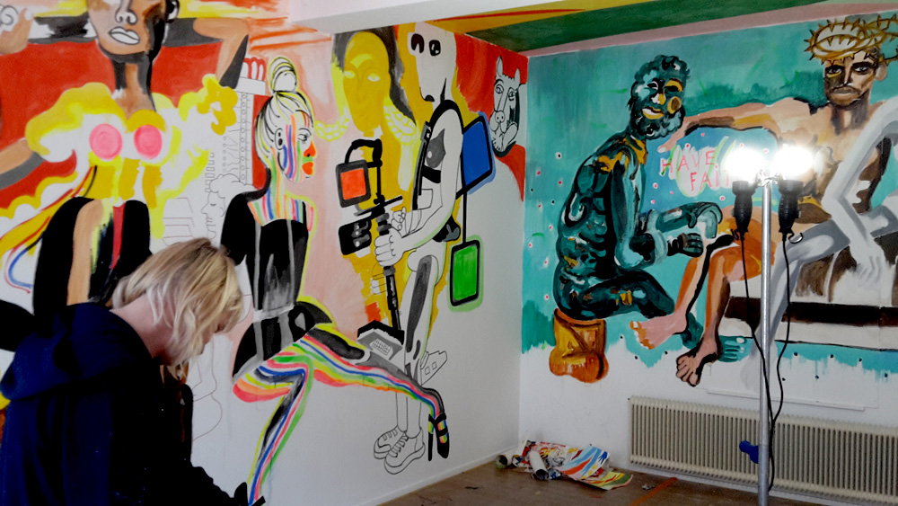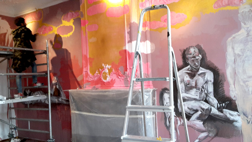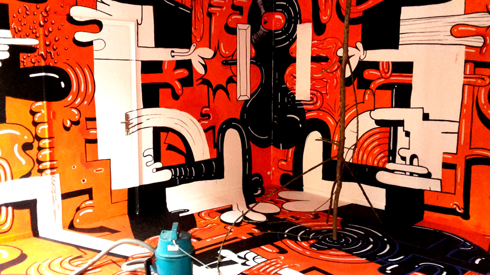 Tijdens het lezen van dit boek in de zomer van 2012 ontstond bij kunstenaar Gijs Frieling het verlangen dit verhaal te gebruiken voor een tentoonstelling met muurschilderingen. Nu, bijna vijf jaar later, nodigt hij 19 kunstenaars uit in Marres Maastricht en beschildert met hen alle zalen, gangen, plafonds, de vloeren en trappen van het monumentale pand. Het resultaat is een overweldigende visuele opera, waar kleuren en stijlen oorlog voeren en vrede sluiten. Verwacht een futuristische supermarkt, een stuk bewaard oerbos, een virtuele detentieruimte een live festival anno 2050 in verf op de muren aangebracht.