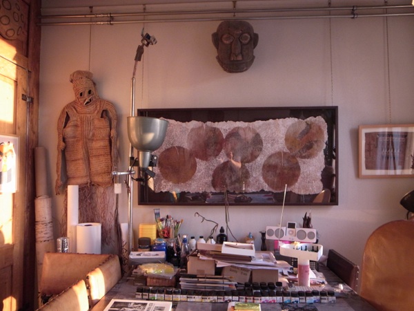 Beeldhouwers staan hoog aangeschreven bij de Maori’s en dat maakte hun acceptatie een stuk eenvoudiger. Raoul en Renate maakten sculpturen van materiaal dat voorhanden was, opstellingen die vanzelf weer verdwenen. Ze hielden van kunst die een functie vervulde in rituelen en het dagelijks leven dat daar vervuld was van geesten en voorouders. Raoul trok maandenlang op met de sjamaan, later ontmoette hij in Afrika ook tovenaars. Als sjamaan maakte hij zijn eigen jas, alsof het een nieuwe stam betrof met alle bijbehorende parafernalia. Ieder ding aan die jas is zelfgemaakt zoals de kokosnoot met een snaar en de ketting en de leren emblemen. Raoul had zijn zakken altijd vol met alles wat hij tegenkwam, zoals zakjes met stenen of een grote schelp en die hangen nu allemaal aan het pak. Voor ze de plek op het eiland hadden gevonden trok Renate een tijd op met een Maori vrouw die haar alles leerde over kruiden en planten. Als een van de kinderen zich sneed dan wist ze met welke planten de wond kon genezen.In die tijd gaven de boeken van Carlos Castaneda hen de inspiratie om gewoonweg te durven vertrouwen en zich over te geven aan wat er zich voor deed. Om los te laten. ‘Door die boeken kreeg je moed om op een andere manier naar de wereld te kijken. Castaneda is er van overtuigd dat je in het leven niet moet zoeken maar dat je de essentiële zaken gewoon tegenkomt, als je ze herkent kun je ze als een cadeau accepteren.’