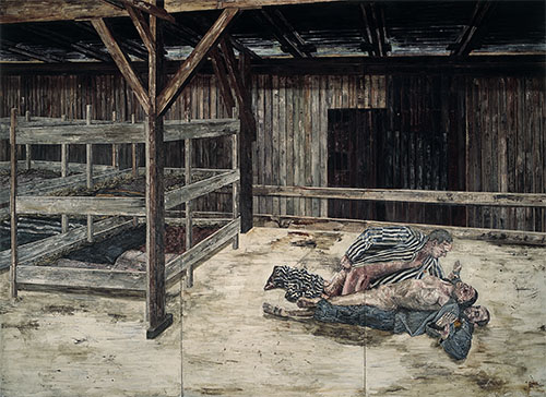 Interessant is de controversie, de shock die dit inzicht oproept. Nog provocerender is het schilderij Birkenau uit 2003, dat twee concentratiekampbewoners afbeeld die een andere kampbewoner verkrachten. De afbeelding wringt. We zijn het niet gewend: slachtoffers als daders afgebeeld te zien. Maar, zegt Ophuis, slachtofferschap is niet heilig. Sterker nog, als alles corrupt is om je heen is het moeilijk om je rug recht te houden. Hoe zuiver kun je zelf blijven, als alle beschaving om je heen wegvalt?