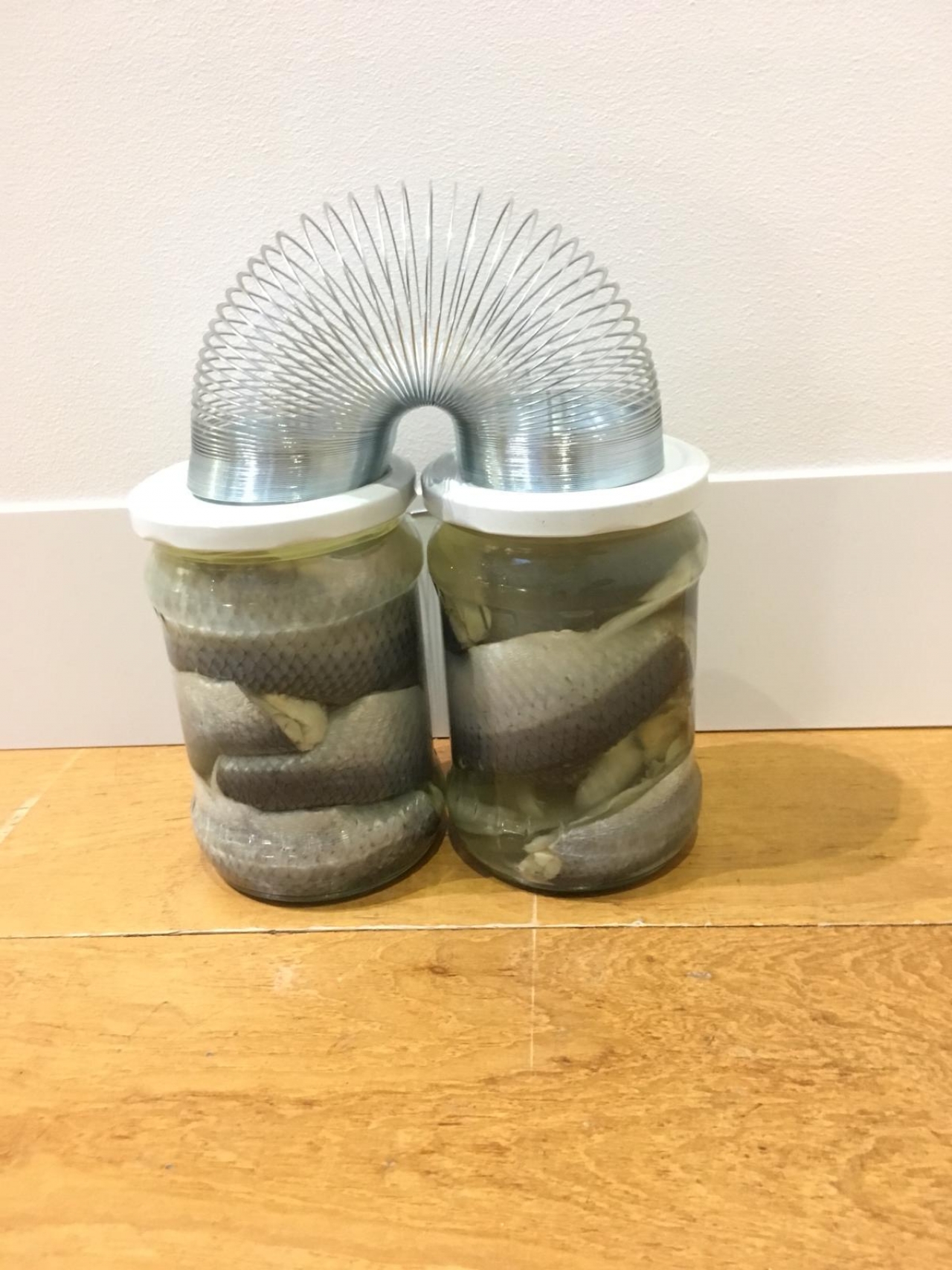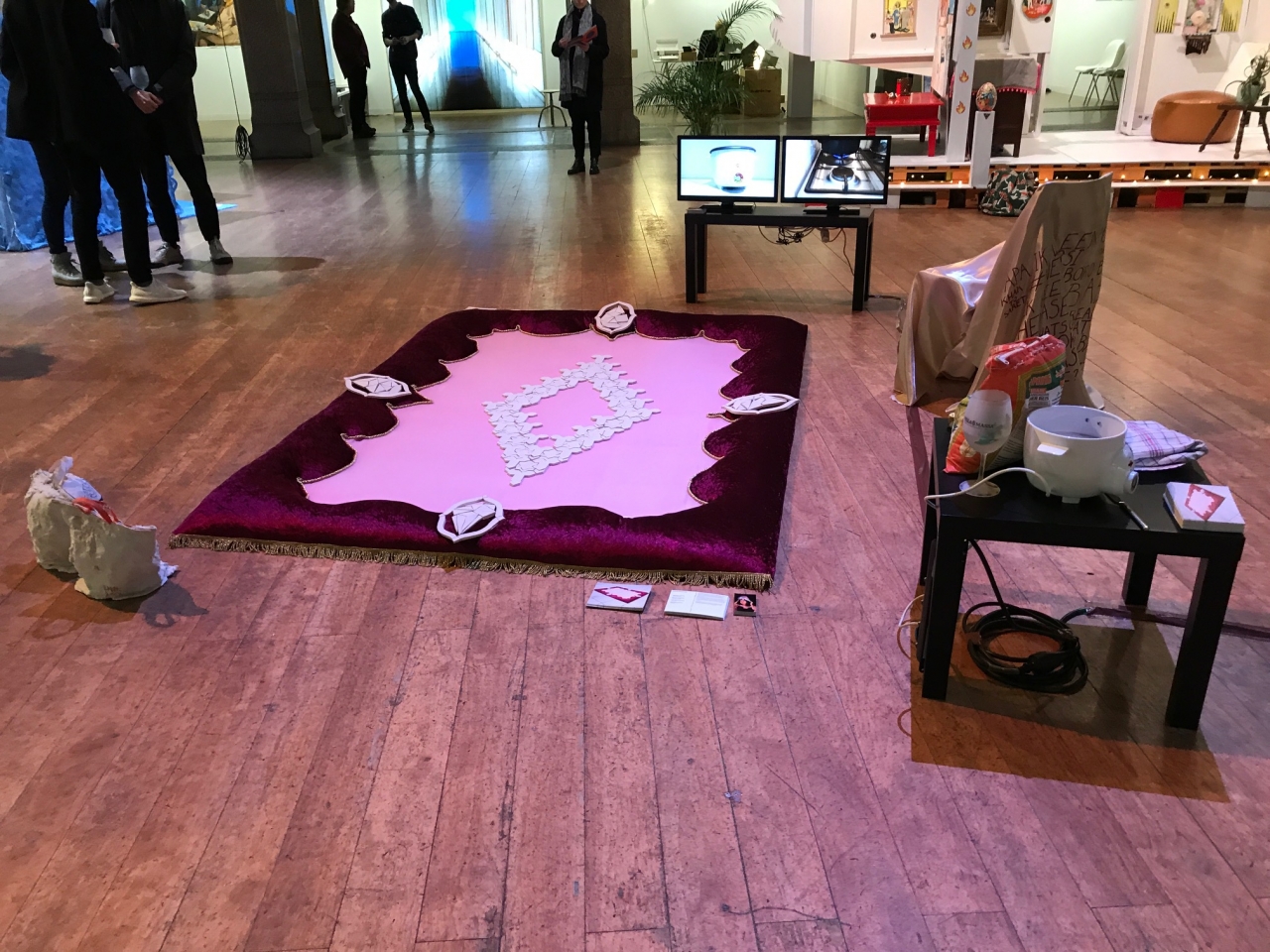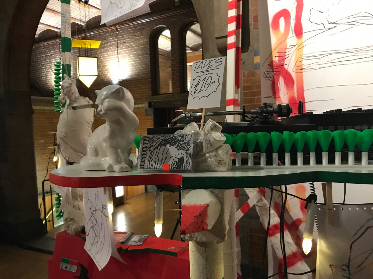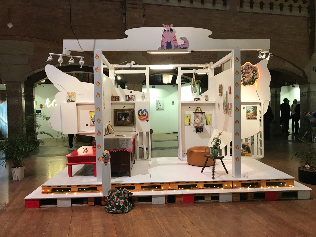 Links de hoek om wacht toiletheer Casper Braat de beursbezoeker op. Hij verkoopt keramieke kunstdrollen voor slechts 25 euro en gebruikt wc-ontstoppers als afzetpaaltjes voor zijn kunst. Naast hem is Danielle Lemaire live aan het tekenen. Aan de wand hangt nieuw én oud werk in de meest prachtige kleuren. Ze deelt haar stand met Desiree Hammen die tijdens de beurs bezoekers uitnodigt om mee te werken aan een kunstwerk dat op 30 december af moet zijn. In dezelfde zaal kun je een DIY breipakket van Dagmar Stap kopen om thuis op de bank een percolator van wol te breien, zijn prachtige (ruimtelijke) werken van Mickey Yang te zien zoals twee potten met haring op zuur aan elkaar verbonden door een Slinky, en word je zo nu en dan gepasseerd door een man in badjas die zich terugtrekt in de logeerkamer van AnneMarie Nijhuis. Een kunstwerk van Ko de Kok is letterlijk uit zijn lijst van de muur gevallen en ligt als een legpuzzel in stukken op de grond