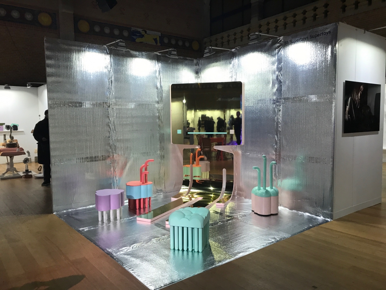In de grote beurszaal zijn veel ‘ruimtes in de ruimte’ te vinden zoals het rondreizende object ‘Temple of Echoes’ van Nathalie Mannaerts en Rutger van der Tas die je uitnodigen om binnen de drukte van de beurs even te onthaasten met een kop thee in hun tempel. Tot groot contrast met de stand van Dagobert Macib. Het lijkt alsof de kunstenaar tijdens het opbouwen van zijn werk in paniek alles uit handen heeft laten vallen en de crime scene begrensd door afzetlint zo snel mogelijk heeft verlaten. En tot slot: de stand van Caz is zoals men inmiddels van hem gewend is een bombastische bedoeling aan fel gekleurde, 3D geprinte werken die verwijzen naar zijn helden uit de kunstgeschiedenis. Tussentijds laat hij een zingend koor aan mannen met gekleurde neuzen door de beurs schuifelen, een performance waarvan de titel in positieve zin perfect de lading van de beurs dekt: ‘I’ve stayed too long at the fair’.