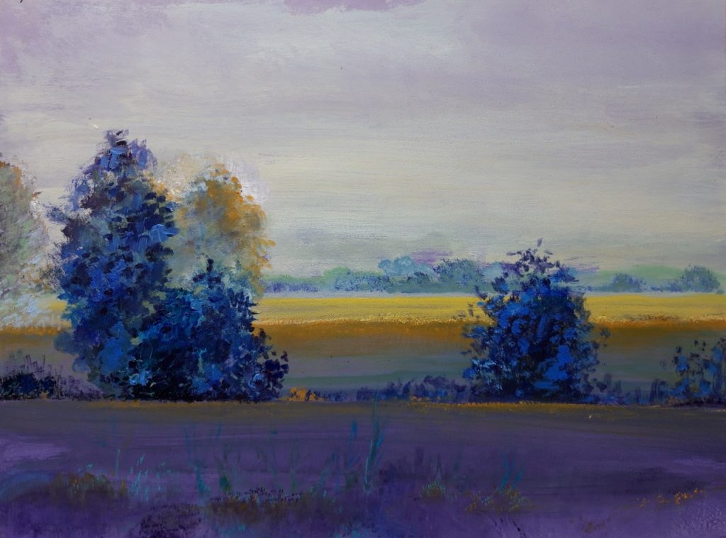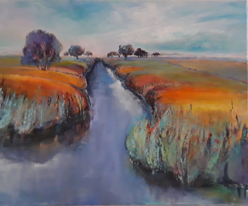 Lida Hofstede woont aan de rand van Enkhuizen. Ze hoeft de deur maar uit te stappen om over de ringvaart uit te kijken naar het vlakke akkerland. Ze heeft haar atelier in de daartoe verbouwde garage van haar woning. Daar haalt ze naar binnen wat ze buiten ziet en intensiveert daar wat ze plein-air schildert in haar verbeelding. Haar landschappen zijn herkenbaar geschilderd, maar overgankelijk in de toepassing van kleur. Als er maar een zweem van kleur oplicht in het landschap verdiept ze die picturaal tot een zindering of trilling. Ze maakt het schilderij tot een meewerkend voorwerp om een innerlijke beleving zichtbaar te maken. Lida Hofstede: “Het landschap heeft een bepaalde gelaagdheid die ook in jezelf zit.”