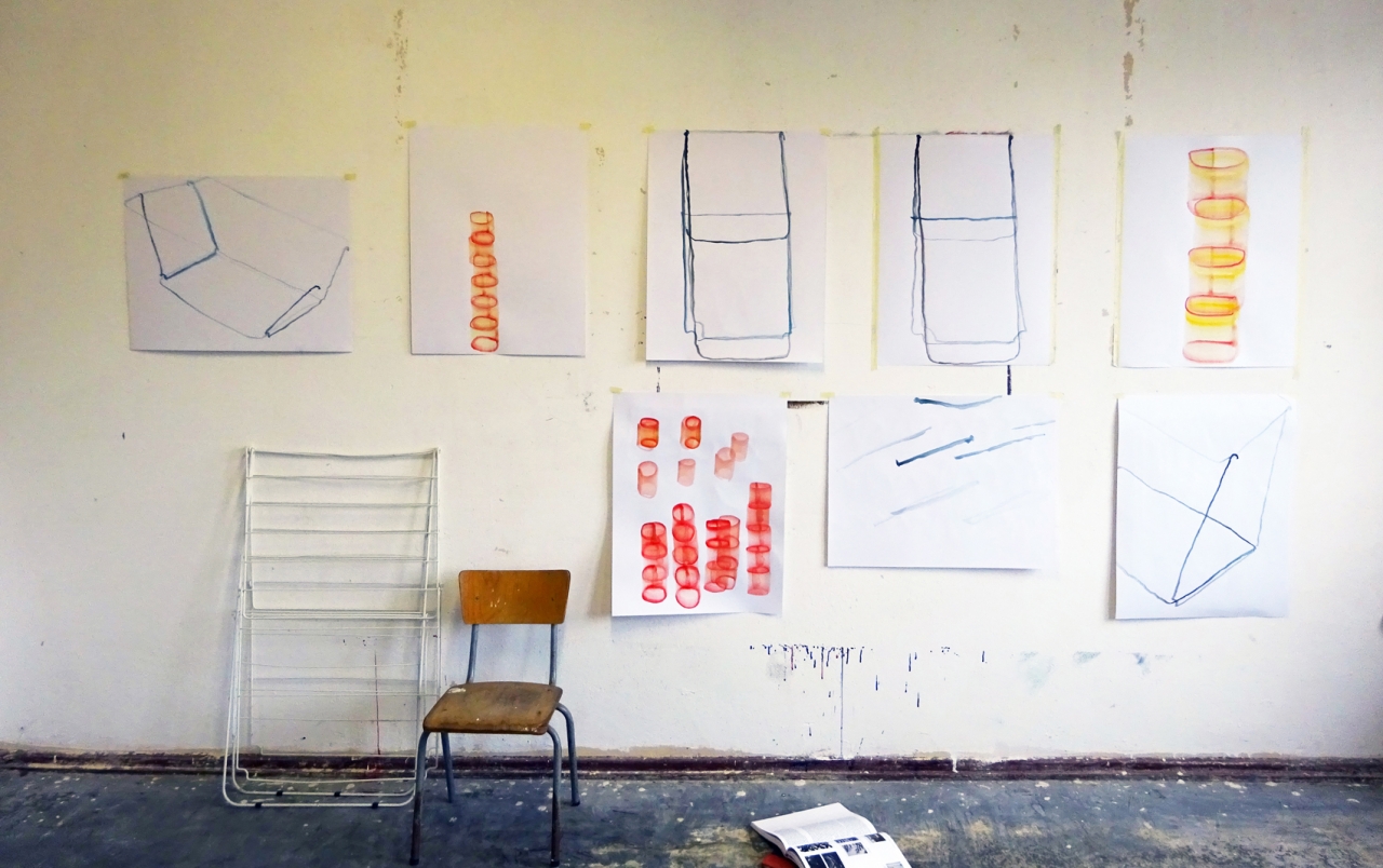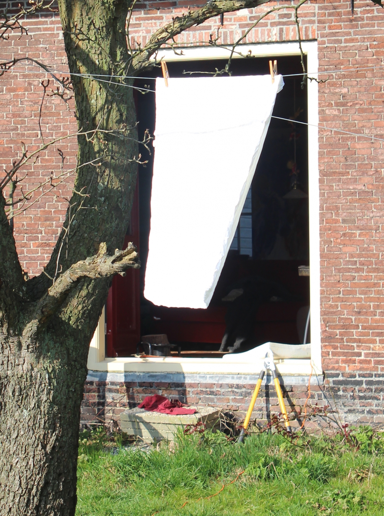 Ik ben nu schetsen aan het maken van lijnenconstructies gebaseerd op een wasrek. De was ophangen is iets wat heel dicht bij me staat. Ik groeide op in de polder bij Zoeterwoude in een boerderij. Hoe daar de lakens aan de lijn hingen, is een beeld dat ik niet vergeet. De was heeft altijd iets lichamelijks en persoonlijks. Vormen moeten ergens vandaan komen, voordat je ze kunt abstraheren tot schilderkunst.”