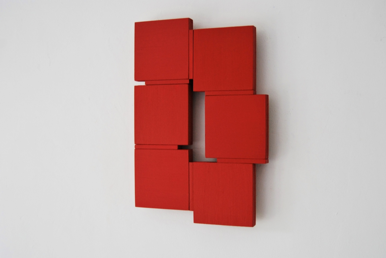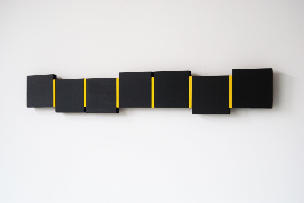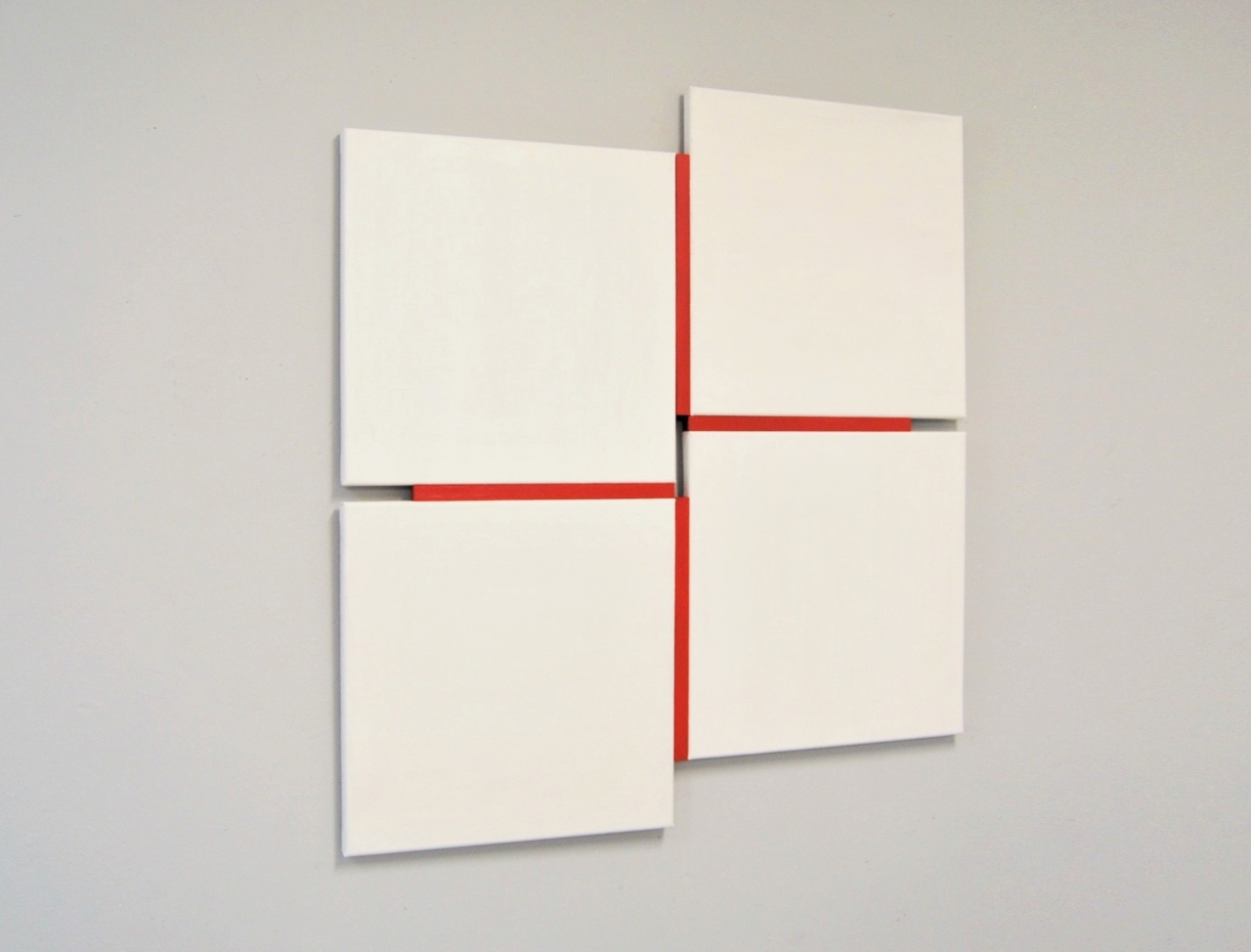 Elk werk uit haar recente serie ‘Shifts’ bestaat uit een aantal monochroom beschilderde vierkante panelen die met dunne latten in een al dan niet contrasterende kleur een compositie vormen. De panelen zijn zo gemonteerd dat om en om de kwaststreek horizontaal of verticaal loopt. Hierdoor ontstaat een roterend beeld van verf waarvan de afwisselende vleug de levendige dynamiek bepaalt. De lengte van de latten is 4/5 van de zijkant van de panelen. Als een paneel 40 x 40 centimeter meet, is de lat 32 centimeter lang. Daardoor ontstaan in het beeld hiaten en verschuivingen en hebben de ‘Shifts’ schilderijen het paradoxale karakter van ruimtelijk werk in het platte vlak.