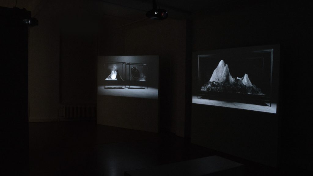 In een vitrinekast is een berg geplaatst, met daarnaast in precies hetzelfde soort kast een rotsachtig stuk steen, in een…