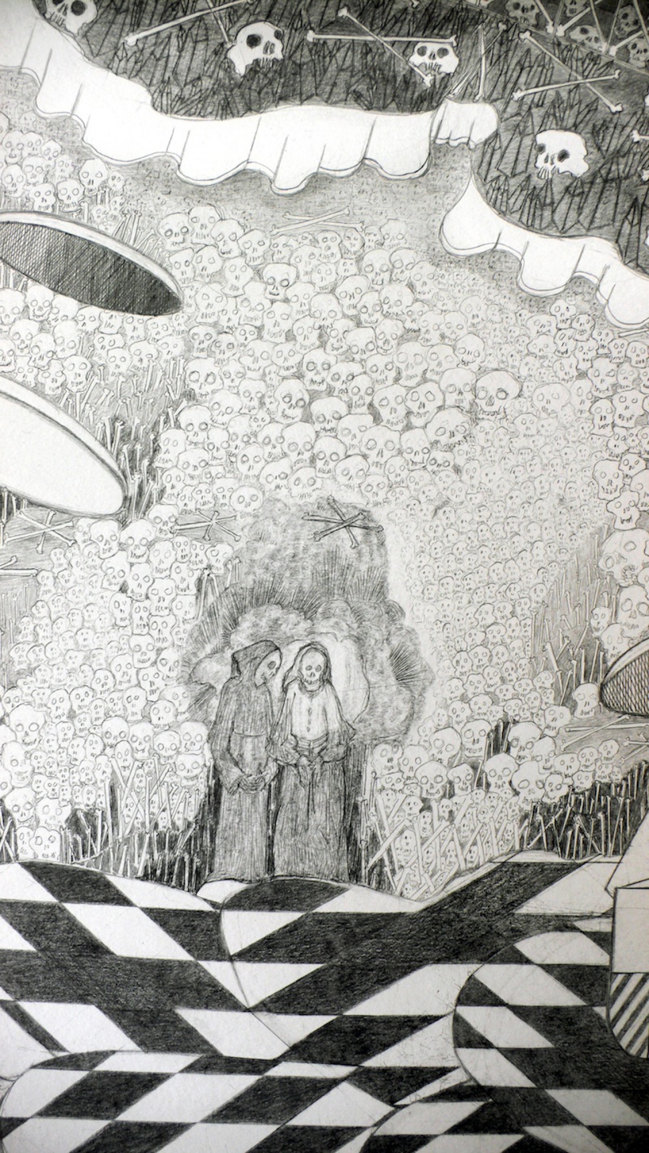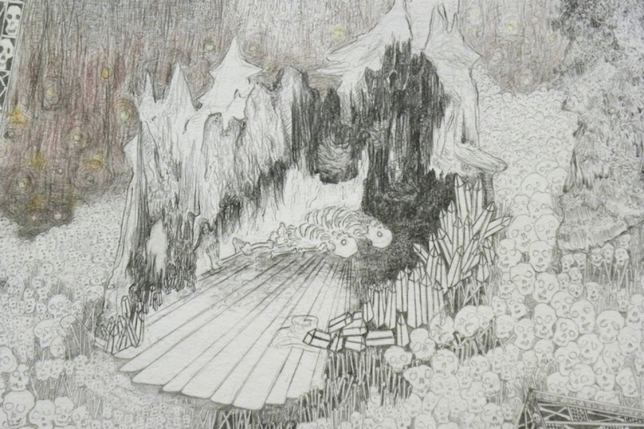 De eerste tekening uit de serie van vier At the Back of Beyond van Mai van Oers gaf me hetzelfde besef van oneindigheid, een overweldigend besef van tijd die alle kanten uit schiet, naar het verleden, de toekomst of de diepte in. Kathedralen, bossen en straten zijn opgebouwd uit doodskoppen, velden met schedels komen aanrollen als een onstuitbare tsunamigolf. We vliegen over de plek heen en kijken naar beneden als een vogel die langs de aarde scheert. Oneindig.
