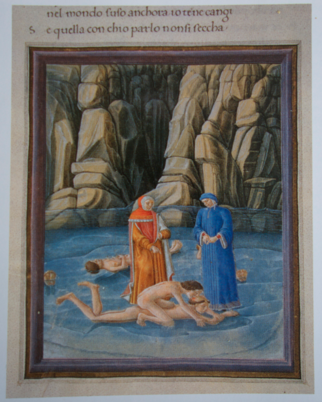 Mai laat me een miniatuur zien in een boek dat gemaakt is in opdracht van Federico da Montefeltro, de man met de kromme neus van het beroemde portret van Piero della Francesca, graaf van Urbino, die een grote bibliotheek bij elkaar verzamelde. Op deze afbeelding van schilder Guglielmo Giraldo aanschouwen Dante en Vergilius de doden in de hel, in de anus mundi. Een kaal rotsachtig landschap omringt een ijskoud bevroren blauw meer onder een norse hemel. De dode zielen zien er uit als mensen. Uit het ijskoude meer zien we de voeten van enkele zondaars omhoog steken en een ziel in de vorm van een naakte mens met zwart haar bijt tot bloedens toe de nek van een andere verdoemde: Graaf Ugolino wordt gezien als verrader van zijn stad Pisa bijt zijn moordenaar, de aartsbisschop Ruggieri, in zijn nek. Zo zullen ze elkaar eeuwig folteren.