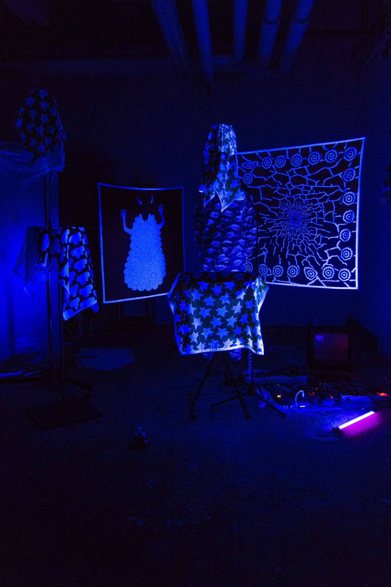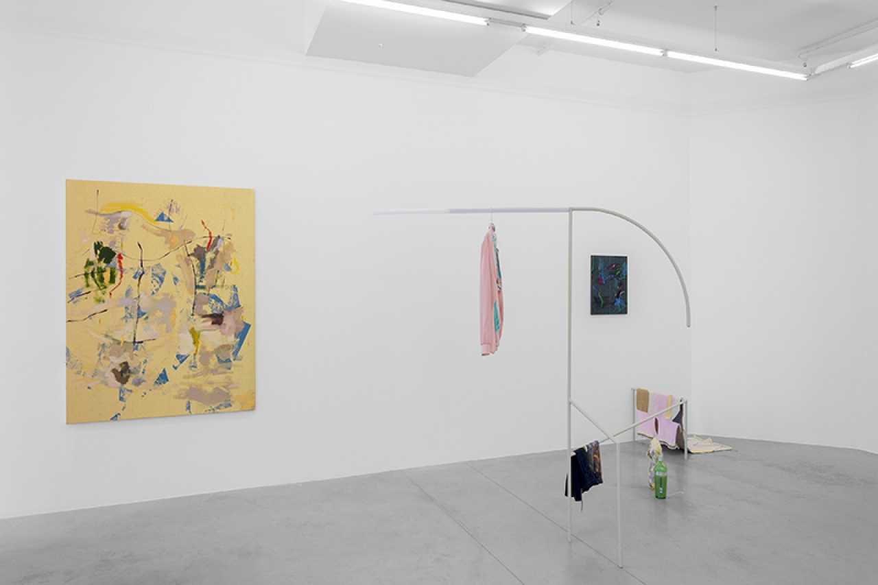 Exhibitions are made into interstices between painting, fashion and architecture. His recent paintings, stretched of silk have motives printed through them, a fragmented image of a costume from the Triadic Ballet designed by Oskar Schlemmer. These paintings are brought into play with pieces of fabric patch-worked and sewn into collaborative, handmade suits and dresses and sculptural structures that function as displays for elements referring to the painting process.