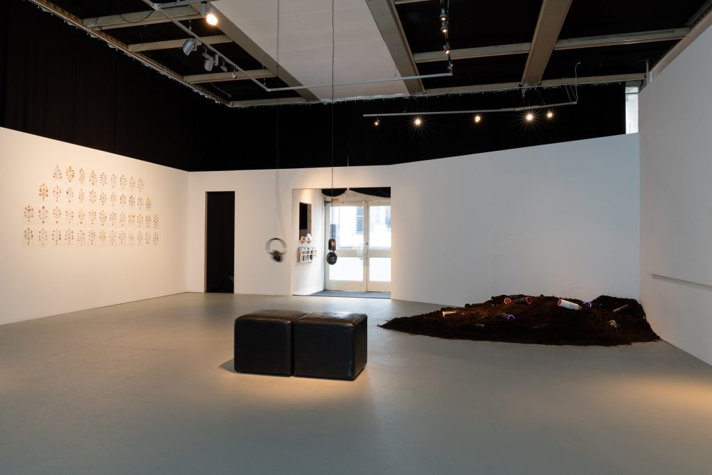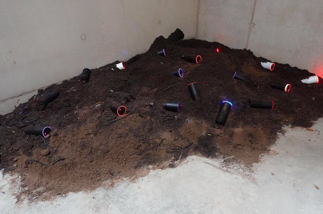 Het eerste werk dat we bekijken is Goatley’s geluidsinstallatie Newly Forgotten Technologies: The Choir. In een berg aarde liggen knipperende, half uit elkaar gevallen bluetooth speakers, maar verder gebeurt er niets. Hey Alexa, roep ik, in de hoop dat de geest van Amazon nog ergens in een van de speakers huist. Het blijft stil, op wat geruis en gepruttel na. De host van P-OST laat weten dat er een storing is, maar dat eraan wordt gewerkt.