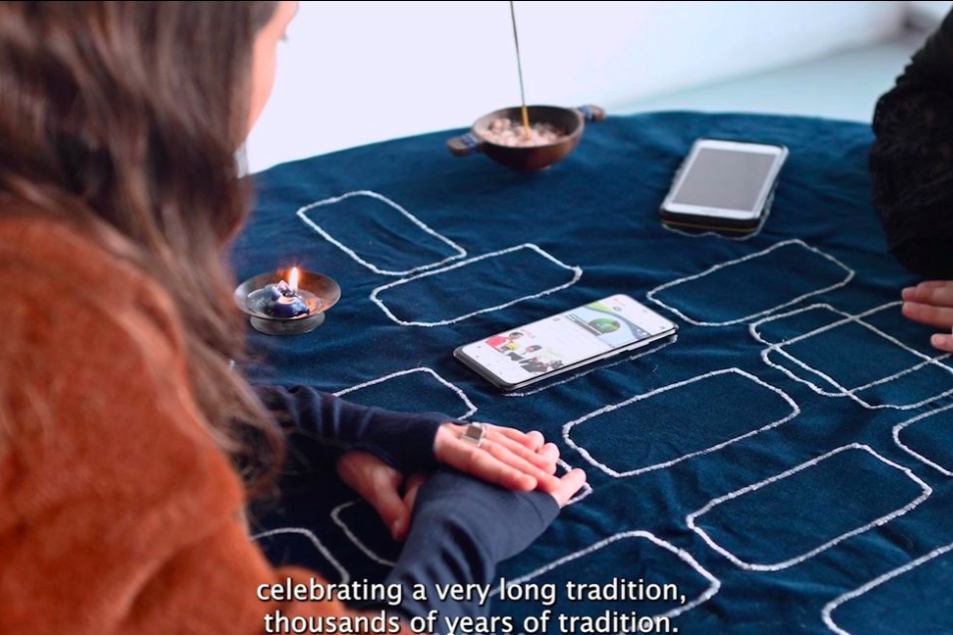 Dan kijken we naar een recent videowerk van Ginevra Petrozzi. De kunstenaar leidt daarin een tarotsessie. In plaats van tarotkaarten wordt een telefoon op tafel gelegd; in plaats van zwaarden en bekers zijn het de advertenties op YouTube en de voorspellende tekstfunctie van de iPhone die als bron van inzicht fungeren. Petrozzi is gekleed als een klassieke waarzegger, met zwarte kanten mouwen die wijd uitlopen. Kristallen en wierook op tafel dragen bij aan de mystieke sfeer. Het gesprek dat zich met haar cliënt ontvouwt is emotioneel en kwetsbaar, over het verlies van een moeder, het zoeken naar identiteit, en de moed vinden om een andere weg in te slaan.
