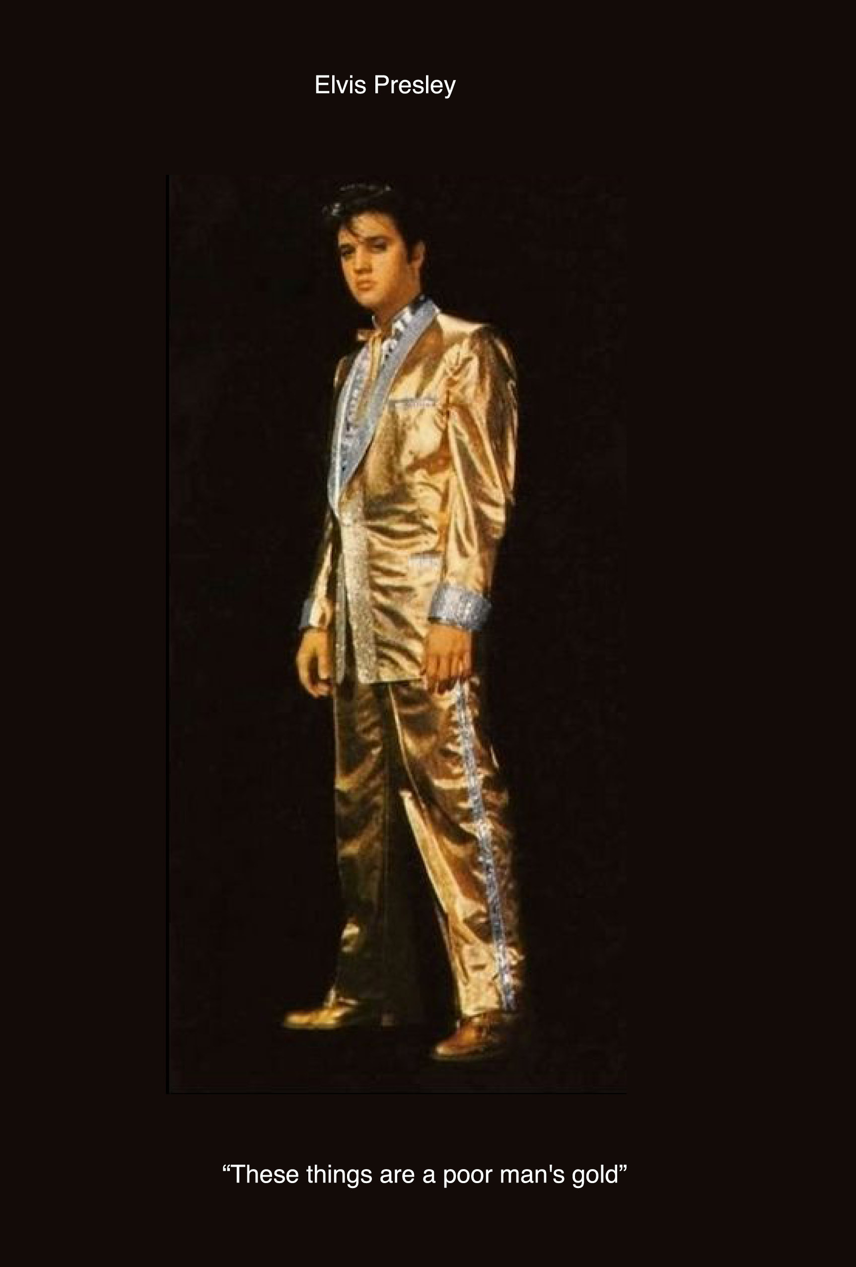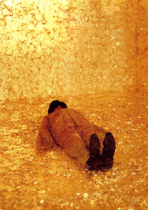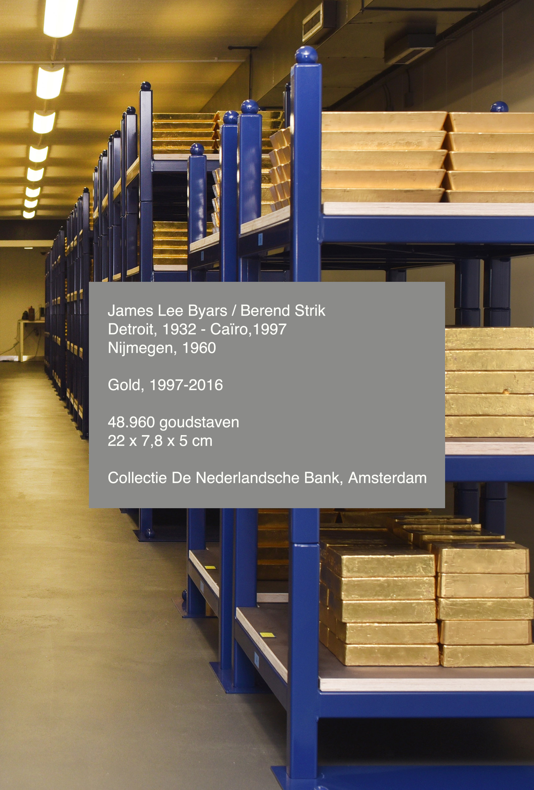 James Lee Byars is één van die kunstenaars. Hij kwam snel bij mij op omdat Byars zich in goud kleedde – geïnspireerd door het gouden pak van Elvis Presley en een zelfportret van Rembrandt – en zich als het ware in goud wentelde. Hij wilde door middel van goud een verbinding aanbrengen tussen de aarde en het oneindige heelal. Byars had geen atelier, hij was een nomade die over de wereld zwierf en overal zijn werk kon maken, door sculpturale elementen in te zetten, zelf sculptuur te worden of door performances op straat waarbij publiek betrokken werd zoals hij veel in Amsterdam heeft gedaan. Tijdens de biënnale van Venetië in 1993 – het jaar dat hij niet was uitgenodigd – overhandigde hij bezoekers bij de ingang een flinterdun gouden muntstuk met daarop ‘your presence is the best work’. Hij kon slechts bestaan, vanwege het immateriële (de gedachten, emoties en fantasieën die het oproept), de enige mogelijkheid om te ontsnappen aan de materiele wereld.