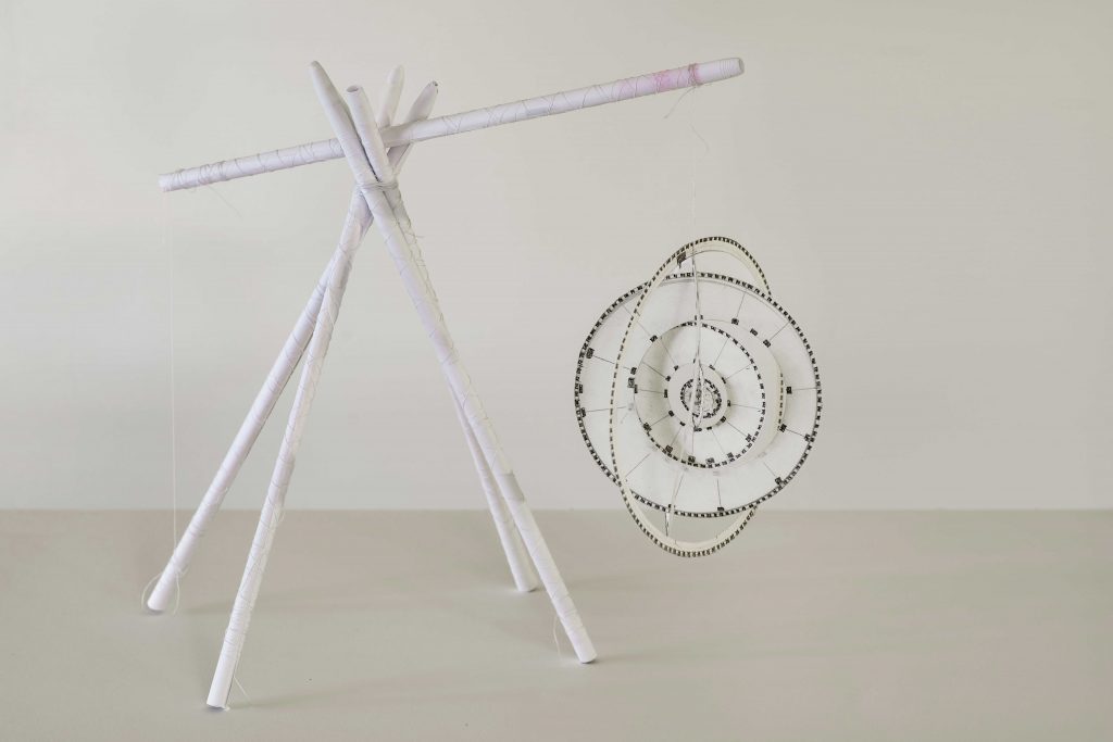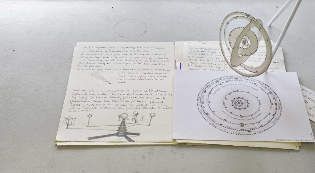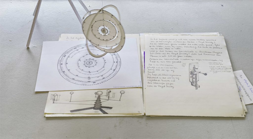 Waarschijnlijk, maar niet uit te sluiten, heb je het Planetarium later niet meer gezien. (Martinus van Marum is er wel geweest) Erg spijtig. Ik heb een tekening gemaakt (los blad) van de planeetbanen, zoals Eise Eisinga die getekend en gebruikt heeft; en zoals dat te zien is aan het plafond. Ik heb er ook een hangende constructie van gemaakt. Hieronder een andere staande constructie.