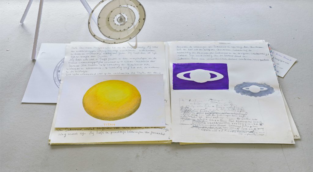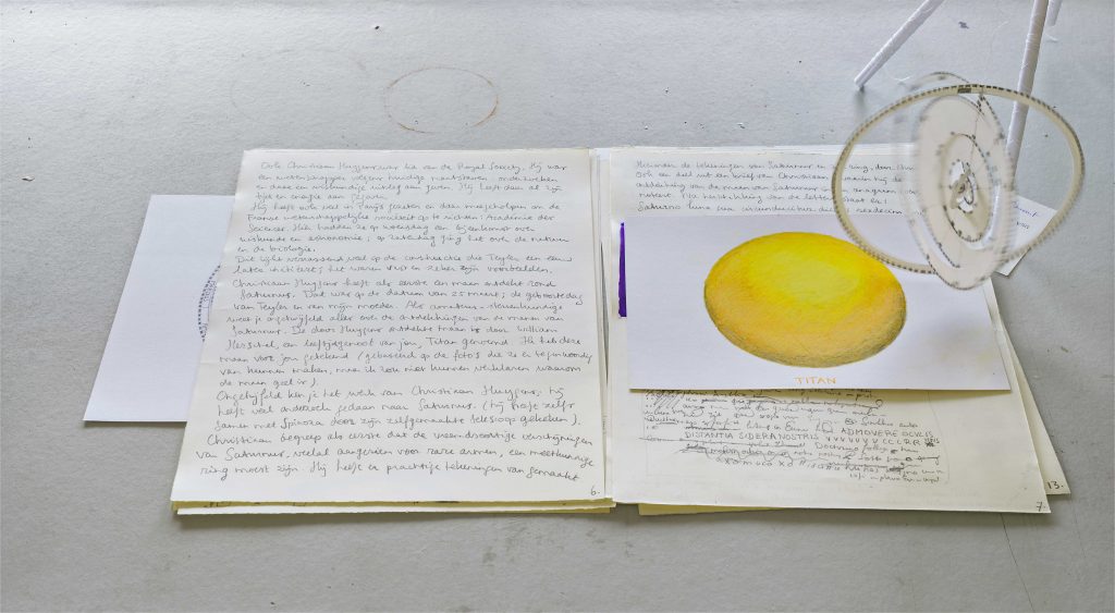Hieronder de tekeningen van Saturnus en zijn ring, door Christiaan. Ook een deel uit een brief van Christiaan, waarin hij de ontdekkingen van de maan van Saturnus in een anagram (versleuteling) noteert. Na herschikking van de letters staat er: