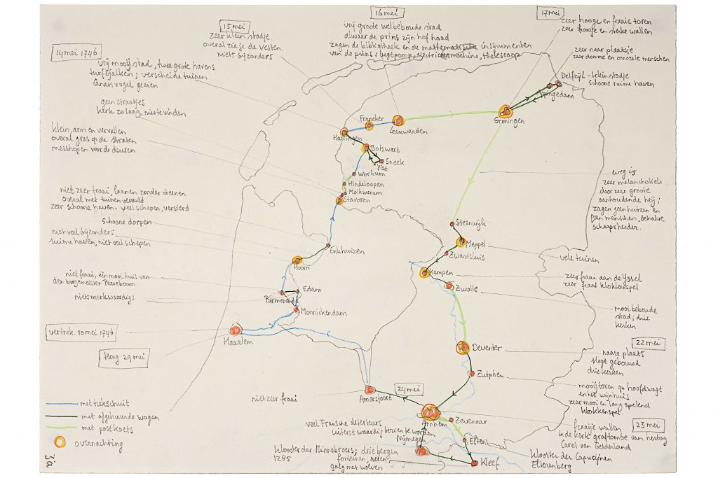 Samen met je vriend Jacob Hoofd heb je een rondreis door Nederland gemaakt. Ik heb de reis in een kaartje getekend, met wat op- en aanmerkingen van jou. De meeste stadjes vond je niet zo fraai; over de havens was je beter te spreken.