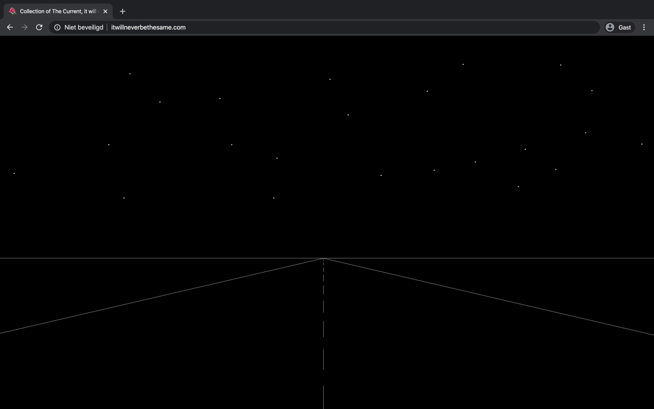 Een witte lijn markeert de horizon. Daar moet je heen. De horizon is het internationale symbool voor: deze kant op a.u.b.. Twee diagonale lijnen verbeelden een kaarsrechte autoweg. Daarboven witte stipjes als sterrenhemel. Wie met de muis klikt ziet het scherm schudden, je komt in beweging.