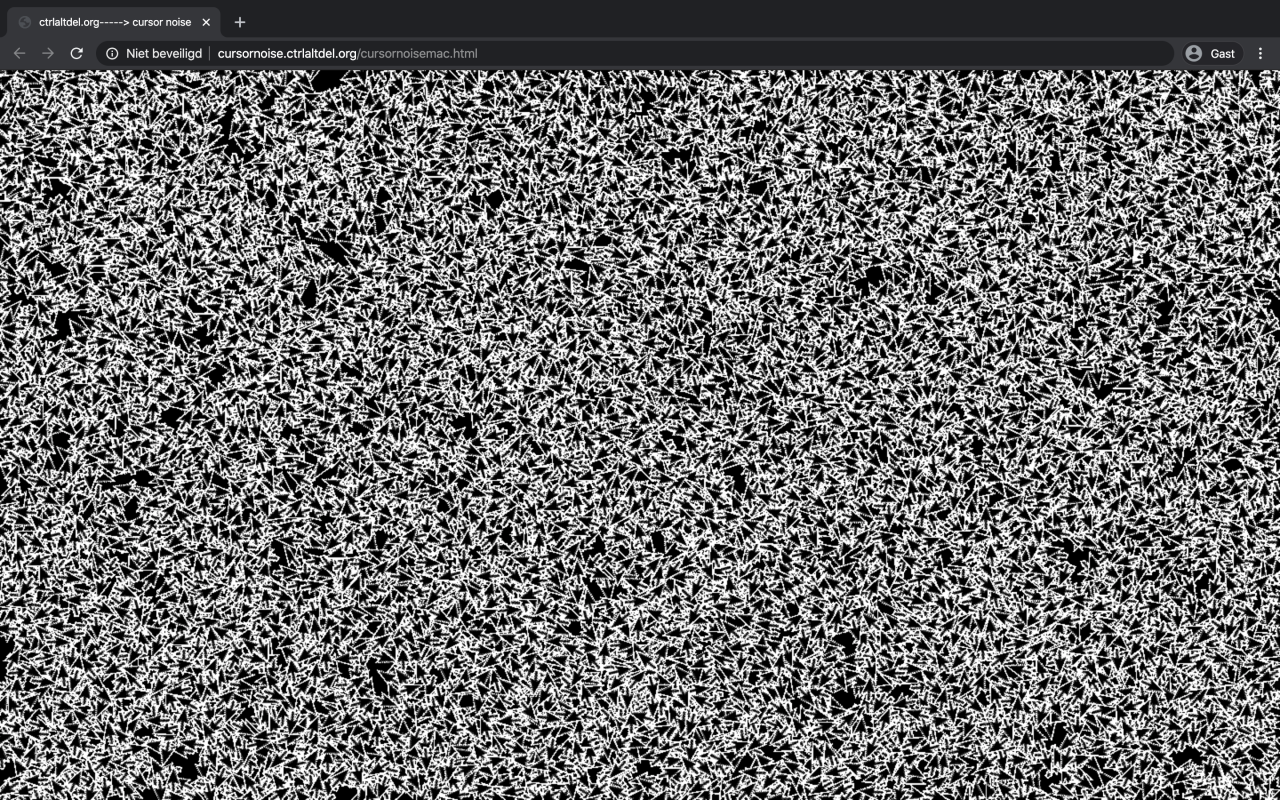 Het gevoel verloren te zijn in de online menigte wordt ook opgeroepen in Cursor Noise (2016) van Peter Luining. Die website vult het scherm met draaiende en heen en weer bewegende muisaanwijzers. Bijna direct verlies je je eigen cursor, je persoonlijke avatar op het scherm, uit het oog, en ga je op in de geruisloze massa. Cursor Noise heeft geen duidelijk begin en einde: het is een animatie, maar niet zoals een .gif-bestand met vooraf bepaalde beelden. Ieder moment is uniek gegenereerd, maar toch blijft alles hetzelfde. Op Twitter kwam ik een beschrijving tegen van de zee, die net zo goed geldt voor Cursor Noise: als je een moment wegkijkt, dan heb je dat moment voor altijd gemist.