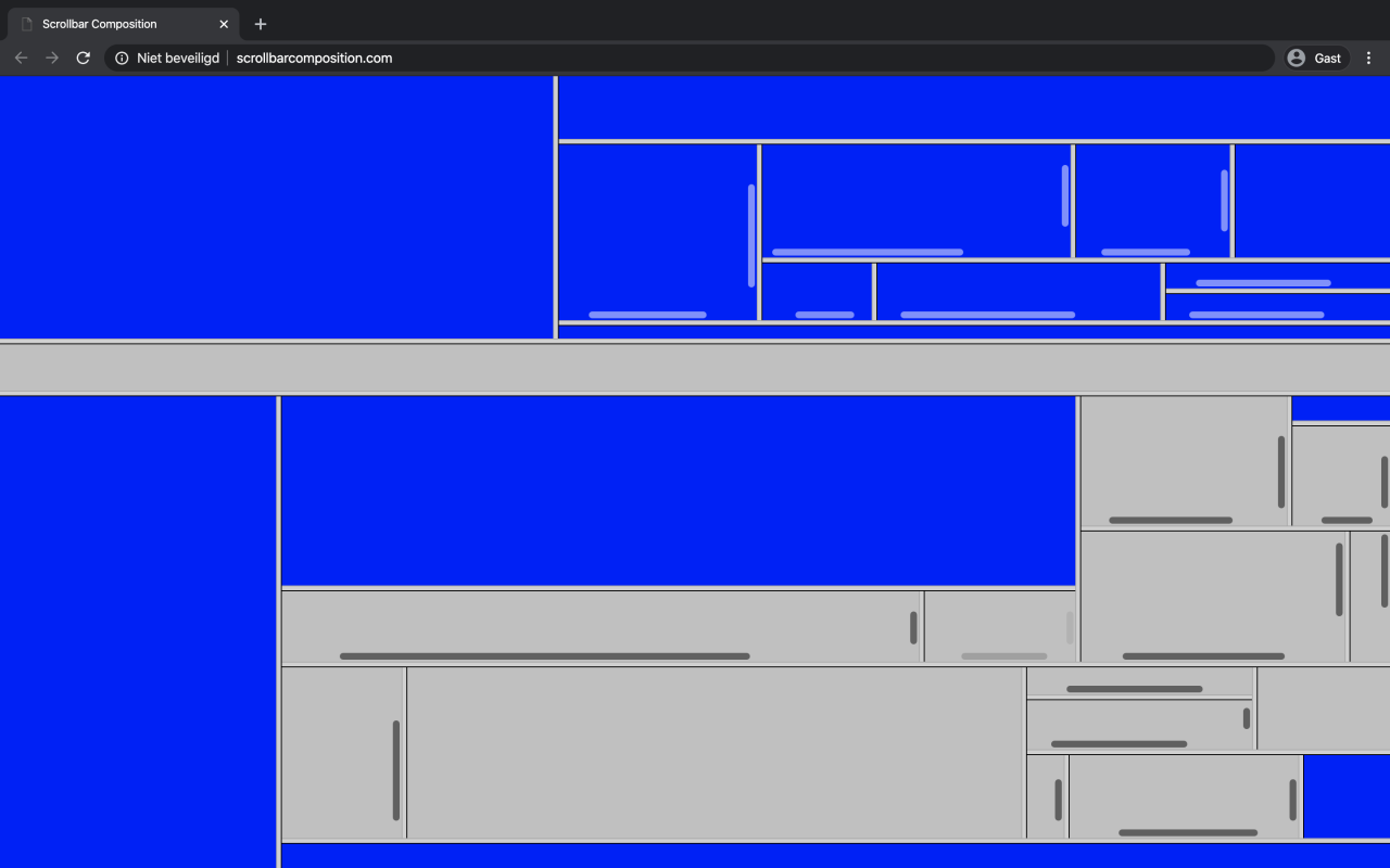 Het al bijna klassieke Scrollbar Composition (2000) van Jan Robert Leegte maakt net als Cursor Noise gebruik van een standaardelement uit je browser. Zijn website, behorend tot de collectie van het Stedelijk Museum Amsterdam, bestaat uit een mondriaanachtige compositie van scrollbalkjes, die rustig heen en weer gaan. Ze zijn in al hun eenvoud een ode aan de bewegingsstandaard op internet: scrollen, scrollen, eindeloos scrollen.