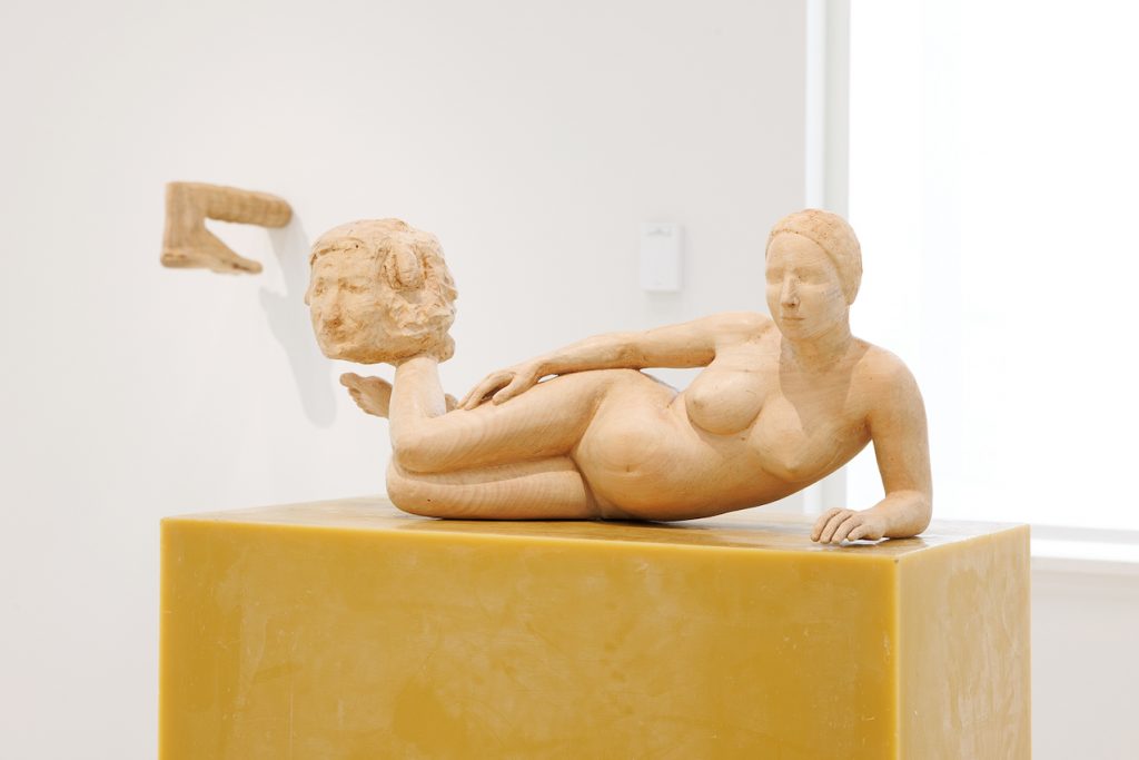 We eindigen de tentoonstelling bij het beeld van een wederom zwangere vrouw, gesneden uit lindenhout. De vrouw ligt in een elegante, en toch krachtige houding op haar zij en kijkt je uitdagend aan. Ze dwingt je om naar haar te blijven kijken. Ze is de sierlijkheid zelve, maar op haar voeten draagt ze een groot, grillig hoofd dat bestaat uit samengesmolten lichaamsdelen. De ‘ruwe, ongepolijste bagage die ze met zich meedraagt’, zo besluiten we het te interpreteren.