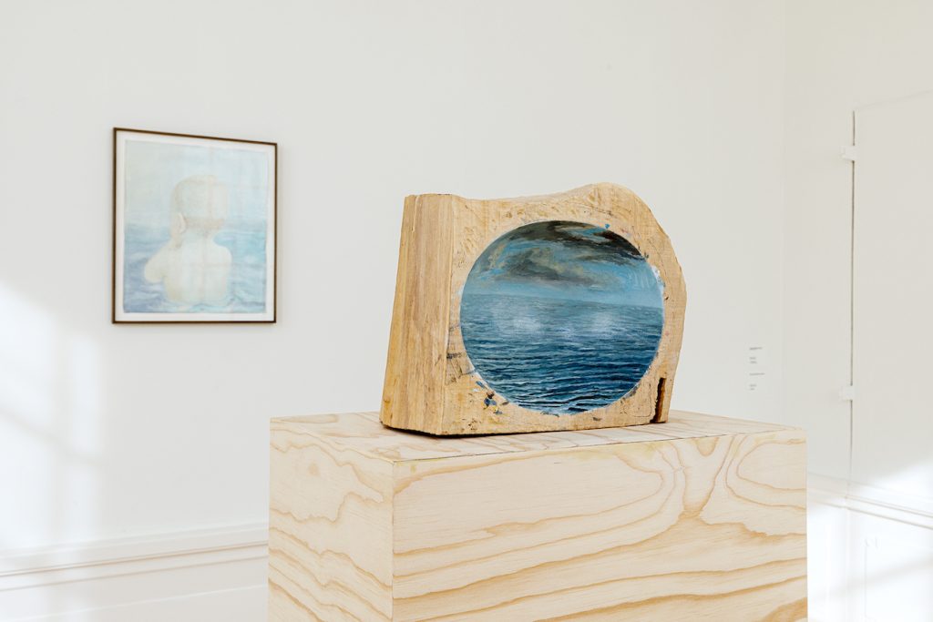 De versmelting van mens en natuur blijkt een constante in het werk van Otten. In de volgende, kleinere zaal staat wederom een houten sculptuur van een zwangere buik, maar minstens zo indrukwekkend is de andere kant, die is uitgehold en beschilderd met een oceaan. De diepte creëert een panorama-achtig uitzicht over de zee.
