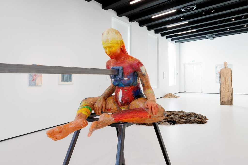 Bij binnenkomst word ik direct begroet door Rainbow Woman: een indrukwekkend beeld van een naakte zwangere vrouw in kleermakerszit. Ze bestaat uit bijenwas in alle kleuren van de regenboog en uit haar borst steekt een lange metalen stang die tot aan de muur reikt. Ondanks de vrolijke kleuren en het vergankelijke materiaal straalt ze pure kracht uit; je kunt letterlijk niet om haar heen. Otten ziet haar werk als een vorm van feministisch activisme, zoveel is duidelijk. Juist het vrouwelijke lichaam, dat zelden de aandacht krijgt tenzij het fungeert als lustobject, krijgt in haar werk de ruimte om gewoon te zíj́n.