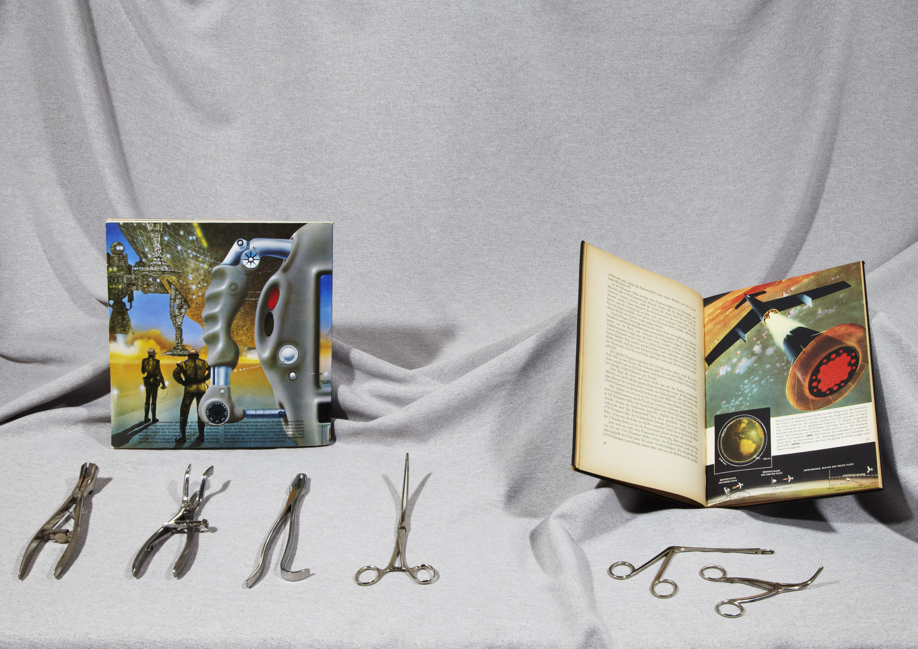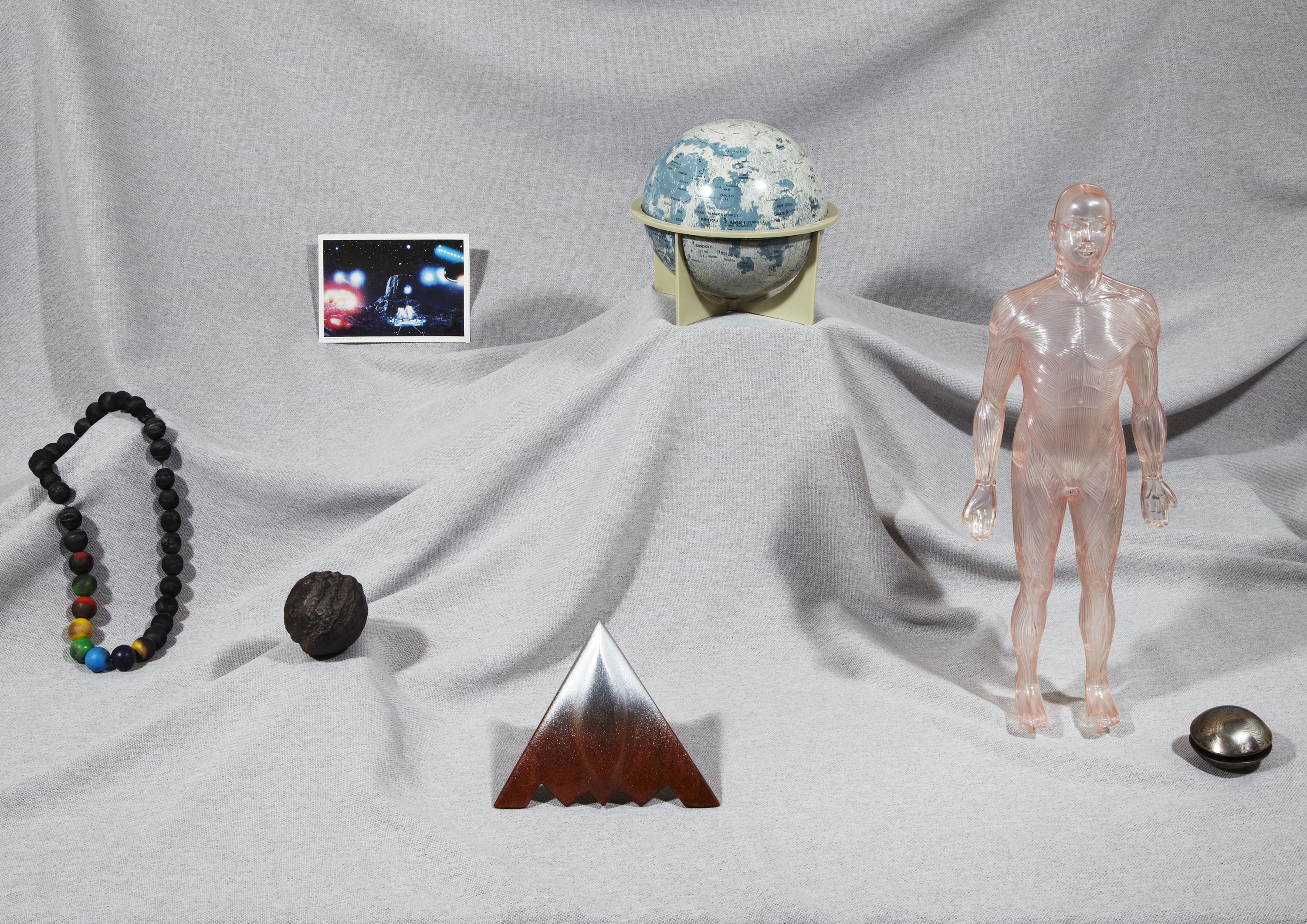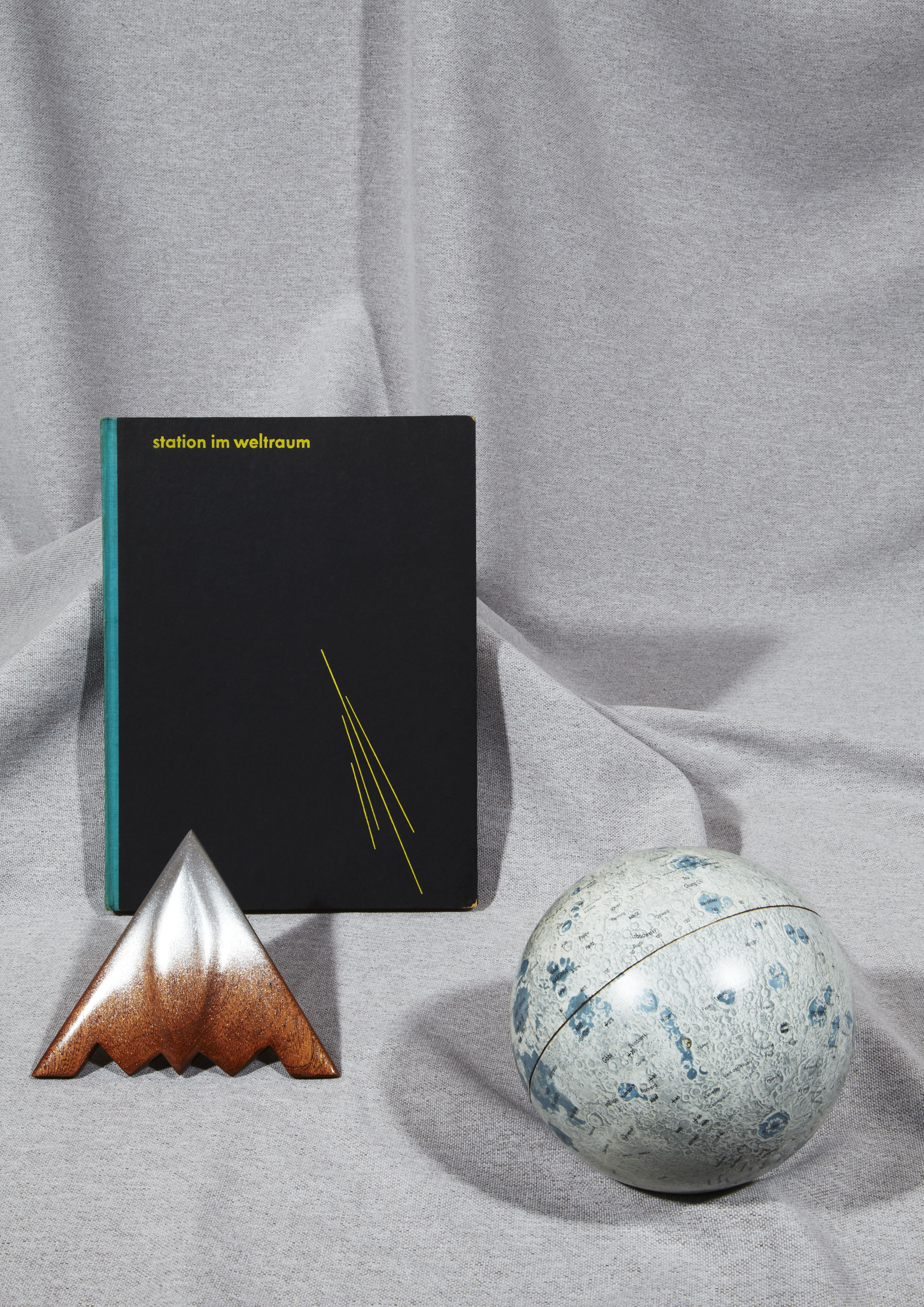 Normaliter moet ik gasten die bij mij thuis komen er van overtuigen dat het stuk roest dat ik ze in hun hand duw al miljoen, misschien wel miljarden jaren door de ruimte gezweefd voordat het met ongekende kracht en geweld op de aarde terecht is gekomen. De reacties daarop zijn naar mijn mening wat aan de bescheiden kant. Een stukje uit de oneindigheid waarvan niemand weet waar het vandaan is gekomen of hoe het er daar uitzag: Wie zal het weten? Ik mag daar zelf graag over fantaseren. Ik heb er voor gekozen om niet enkel ruimte objecten te laten zien, maar juist een gevarieerd overzicht van objecten waar ik mij dagelijks in mijn slaap- en woonkamer mee omring. Deze objecten vormen bron van inspiratie voor het werk dat ik doe als vormgever, vandaar dat ik ze heel dichtbij me houd. Van sommige objecten die ik voor Mister Motley heb uitgekozen geloof ik zelfs dat ze bepaalde krachten hebben, terwijl ik doorgaans niet geloof dat een stukje kristal om je nek dragen kan helpen bij het overwinnen van een hernia. De krachten waar ik het over heb, heb ik zelf aan ze toegekend. Meestal vanwege het bijzondere verhaal dat er achter schuilt, de vreemde plek waar ik ze gevonden heb, of de vreemde functie die ze ooit misschien hebben vervuld. In de selectie vind je o.a: een groot stuk meteoriet uit Rusland genaamd ‘Sikhote Alin’, Een antiek boek over ruimtevaarttechnologie afkomstig uit Duitsland, maar van ver vòòr de tijd dat ruimtevaart mogelijk werd, een blikken maanglobe die tijdens de koude oorlog vaak op de bureaus van wereldleiders te vinden was, medisch gereedschap, 2 zelfgemaakte objecten en een piramide vormige presse-papier met kristallen er in. met dank aan Ninette Schostack Photography & Terra Incognita Amsterdam.