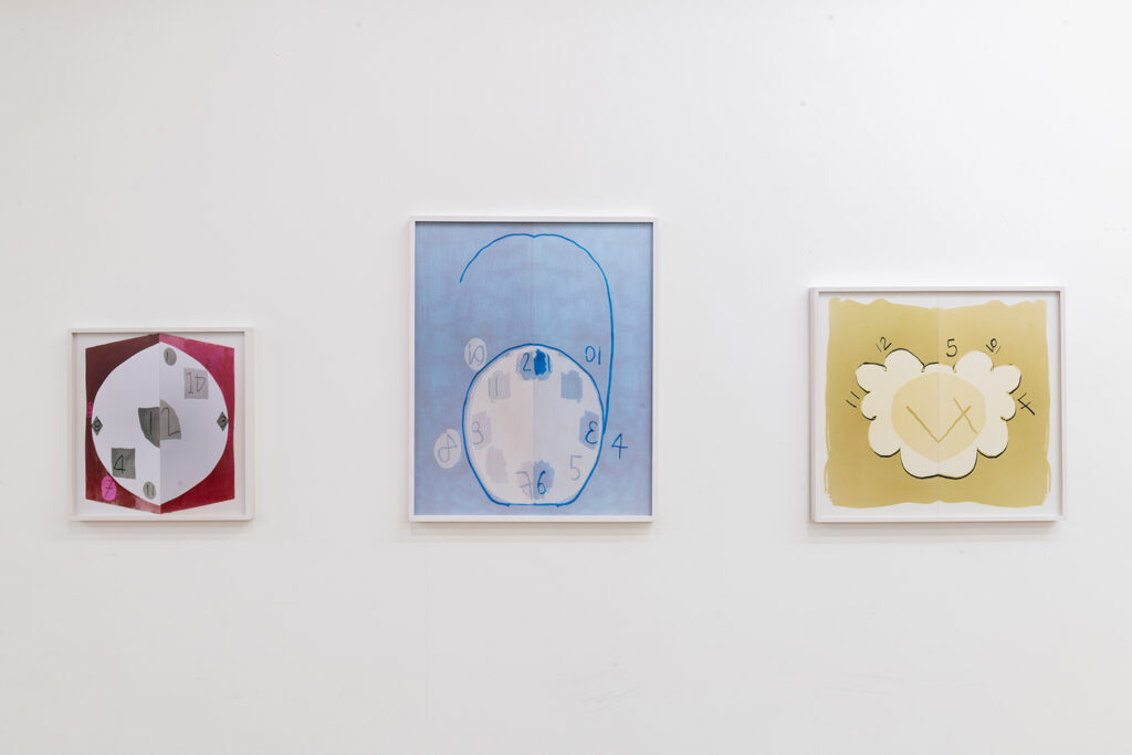 Van dit werk loop ik recht de tijd in. Een verzameling van klokachtige afbeeldingen waar ik cijfers en volgorde in denk te herkennen, glijdend van de muur of kruipend richting de hoeken van de ruimte. Zonder een vaste structuur van werk en een relatie is de tijd gevaarlijk voor me geworden. De reeks Time is an Arrow van Katja Mater herinnert me aan de dagen dat ik de tijd vergeet en het licht is verschoven op de muur. Er zijn dagen dat ik opnieuw en opnieuw en opnieuw naar de klok kijk om te zien of het al tijd is voor een afspraak. Dan worden de vormen van uren en minuten bevreemdend. Die verschillende belevingen hangen nu voor me in fotografisch werk en slokken me ruimtelijk op zoals alleen de tijd dat kan.