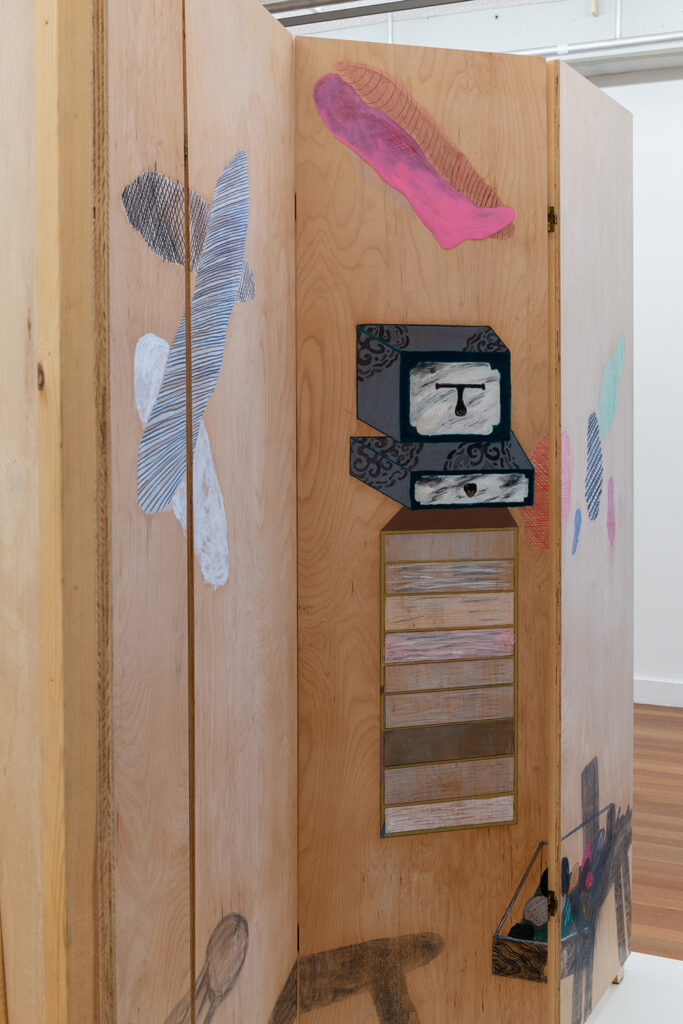 In de eerste zaal valt me de verdeling van de ruimte op. Een kamerscherm staat verheven, achter een glazen wand. Het is uit zijn loutere functie van interieurobject verheven tot kunstwerk, maar verdeelt alsnog de exporuimte. Op de houten, drieluikige paravan staan speelse tekeningen van elementen uit een kamer. Ik kan de tekening op het scherm niet aanraken, verplaatsen of er dichtbij komen. Ooit zal ik de muren vergeten van mijn huidige huis, ik zal vergeten waar de witte lamp staat en verlangen naar een oud gevoel van thuiskomen. Het idee van de kamer is zichtbaar maar ik kan er niet in. Het werk Diamond Dancer van Valérie Mannaerts toont een moment in een thuis dat iemand op een kamerscherm, van huis naar huis zal meenemen maar nooit meer heen kan.