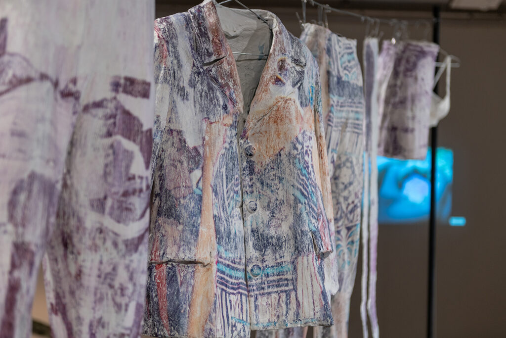 Een installatie met in gips gegoten kleding staat centraal in diezelfde ruimte. Hangend aan een waslijn worden de kledingstukken standbeelden van wat ooit zacht en warm was. In een video zie ik hoe iemand zich in die harde vormen probeert te hijsen. Ik zie de moeite en het duwen van het lichaam in een vaste vorm maar ook hoe het materiaal breekt en kraakt. Naast de installatie Virgy’s Boutique van Angyvir Padilla hangt het werk van Danai Anesiadou. De kleuren van het sierlijke epoxy roepen magie op. Spiegeltje, spiegeltje aan de wand klinkt in mijn achterhoofd. Ik vraag me af, als ik me in de verwachtingen van mijn geliefde of werk had kunnen hijsen, had dat als thuis gevoeld?