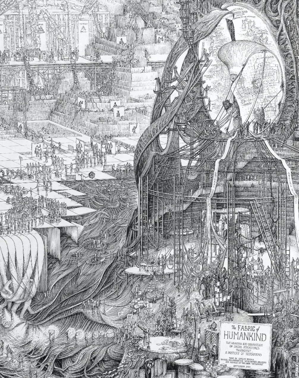 Carlijn Kingma noemt zichzelf cartograaf: ze maakt enorme zwart-wit tekeningen waarin ze abstracte geschiedenissen en sociale situaties vertaalt naar architecturale tekeningen, die zich laten lezen als verhaal. Haar nieuwste tekening heeft ze gebaseerd op Rutger Bregmans De meeste mensen deugen en wordt in samenwerking met De Correspondent gepubliceerd. Bekijk het hier: https://decorrespondent.nl/hetweefseldermensheid