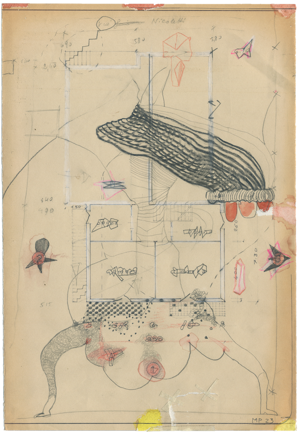 ‘De schildpad is een heilig dier. Zij is verstandig en draagt haar schild als de aarde op de rug. Bij de Sioux wordt na de geboorte de navelstreng in een schildpadvormig amulet gedragen. Er zijn zowel land- als zeeschildpadden en zij is een oeroud wezen. Voor mij is de schildpad een beeld waar alles bij elkaar komt waarvoor ik een plek creëer, een kiosk of een gazebo die ik als architectuur ontwerp en teken. Tijdens een recente residentie in Pergola in Italië heb ik die ideeën verder uitgewerkt door oude architectuurtekeningen als uitgangspunt te nemen als de cartografie van mijn verbeelding. Het gaat over een ander idee van de werkelijkheid dat ik heb ontdekt tijdens het duiken in de Rode Zee. Onder water ben je weg van de herkenbare wereld. Je bent ervan afgesloten, het is geen omgeving voor de mens. Als kind was Jacques Cousteau, de Franse documentairemaker over het leven in de zee, al mijn held.’