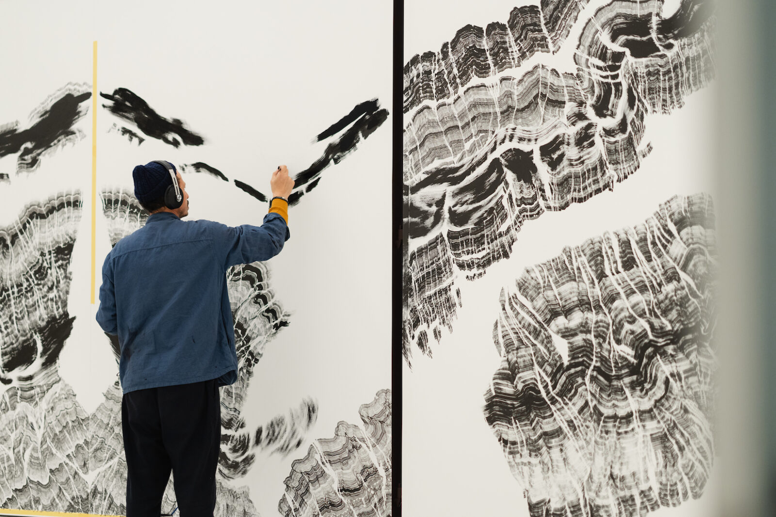 Sommige termen komen telkens terug wanneer je over de inhoud van je werk spreekt, ‘schrijven’ en ‘schilderen’ bijvoorbeeld. De manier waarop je schildert, met zwarte inkt op een wit oppervlak, en lijnen trekt die een soort samenhang vormen, doet denken aan de kalligrafie. Vormt deze complexiteit de basis van je oeuvre, of veranderen je werkwijze en je thema’s ook wel eens? In de tentoonstelling Solastalgia: Archeologies of Loss (Power Plant, Toronto 2023) leek de relatie tussen mens en natuur bijvoorbeeld meer op de voorgrond te staan, terwijl de huidige tentoonstelling zich richt op het geheugen, het verleden en het heden.