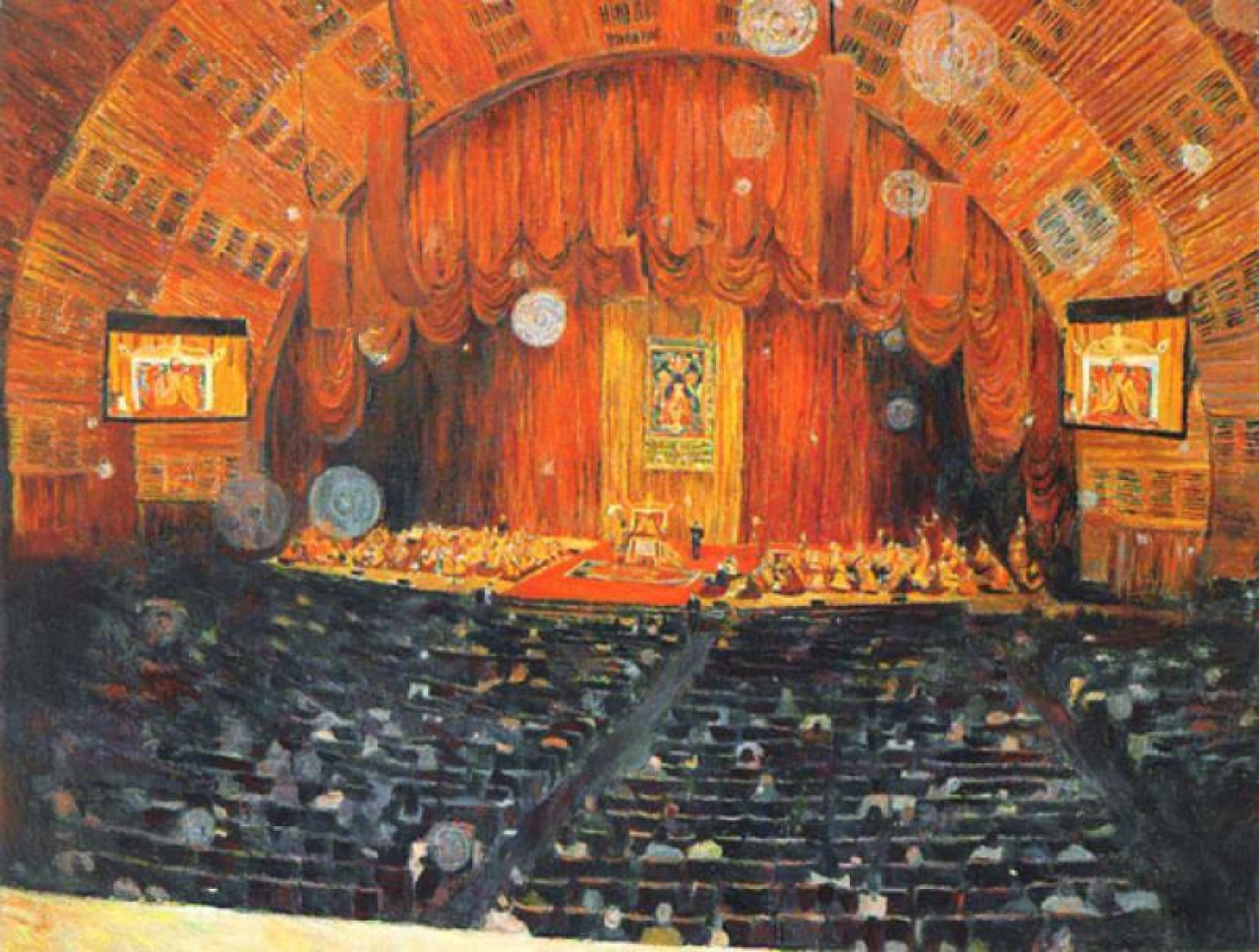 ‘The Dalai Lama Teaching the Diamond Cutter Sutra and Seventy Verses on Emptiness at Radio City Music Hall.’ van Keith Mayerson. I love it so much!