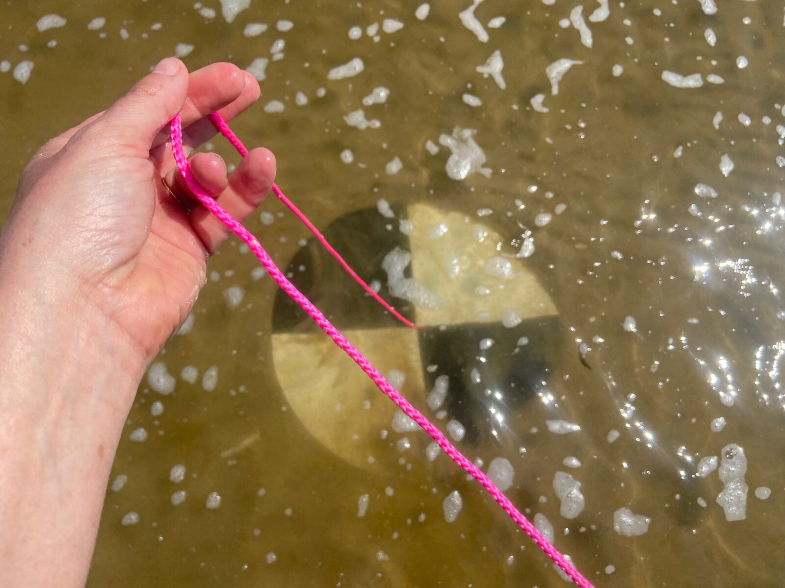 De laatste dag besluit ik twee enorme houten schijven het strand op te trekken. Ik heb ze meegenomen om mee te spelen. Ik wil de cirkels, als symbool van alles dat met elkaar verbonden is, laten bewegen op de plek waar twee zeeën elkaar mogelijk ontmoeten. De cirkels van 120 cm doorsnee hebben een kleine sleuf en steken in elkaar. De verhouding komt nauw maar als het juist is, bewegen ze samen prachtig in de wind.