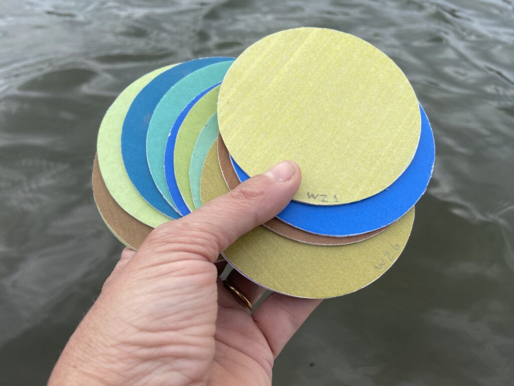 De kleur van water intrigeert ons dus al heel lang en we vermoeden dus ook al heel lang dat het ons iets vertelt. Maar wat vertellen de 21 kleuren van de Forel-Ule schaal nou precies? Een vraag waar ik bij het lezen van de thesis eigenlijk geen antwoord op vind. Ik besluit om mijn zelfopgelegde spaarzame ChatGPT rantsoen voor deze vraag in te zetten. ‘Weet jij waar de 21 kleuren van de Forel-Ule schaal voor staan?’, vraag ik haar. ‘Jawel hoor. Hoewel de exacte omstandigheden enigszins kunnen variëren, afhankelijk van interpretatie en omgevingsfactoren, zijn de algemene kenmerken van elke kleur als volgt.’ En dan verschijnen één voor één de kleurnummers en hun condities onder elkaar op mijn beeldscherm. Nr 3: Groenachtig wit (Vert-Blanc): Melkachtig of troebel water met slechte transparantie en een groenachtige tint, wat wijst op een hoge troebelheid en zwevende deeltjes. Nr 12: Vuil geel (Jaune-Sale): Geelachtig water met slechte transparantie en hoge troebelheid, dat waarschijnlijk zwevende sedimenten of verontreinigende stoffen bevat.