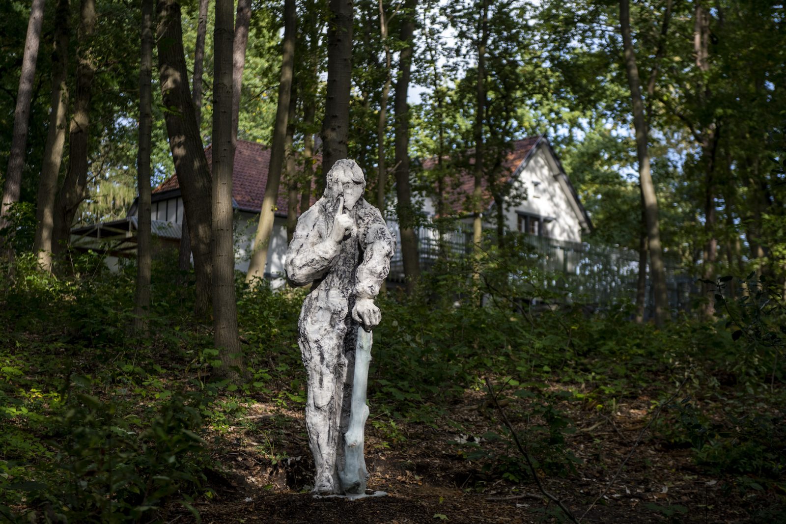 Eenmaal buiten wijst Mounir mij nog op een aantal kunstwerken in het parkje, waaronder een beeld van Caroline Coolen onderaan de heuvel. Het begint echter zo hard te sneeuwen dat we het kunstwerk nog amper kunnen zien. Op de valreep vraag ik naar dat afdakje waar Mounir zo graag ging schuilen. Het blijkt pal aan de ingang van het museum te liggen. ‘En dan zat ik hier, en dan was het dicht, niemand was binnen.’ Hij vertelt dat hij hier met vrienden kwam en gesprekken voerde over The Building of andere zaken, ‘om ons ongenoegen te uiten’. Het voelt voor Mounir als een groep rokers die soms op dezelfde plek samenkomen. ‘Dat dat gewoon kan onder een afdakje van een museum.’