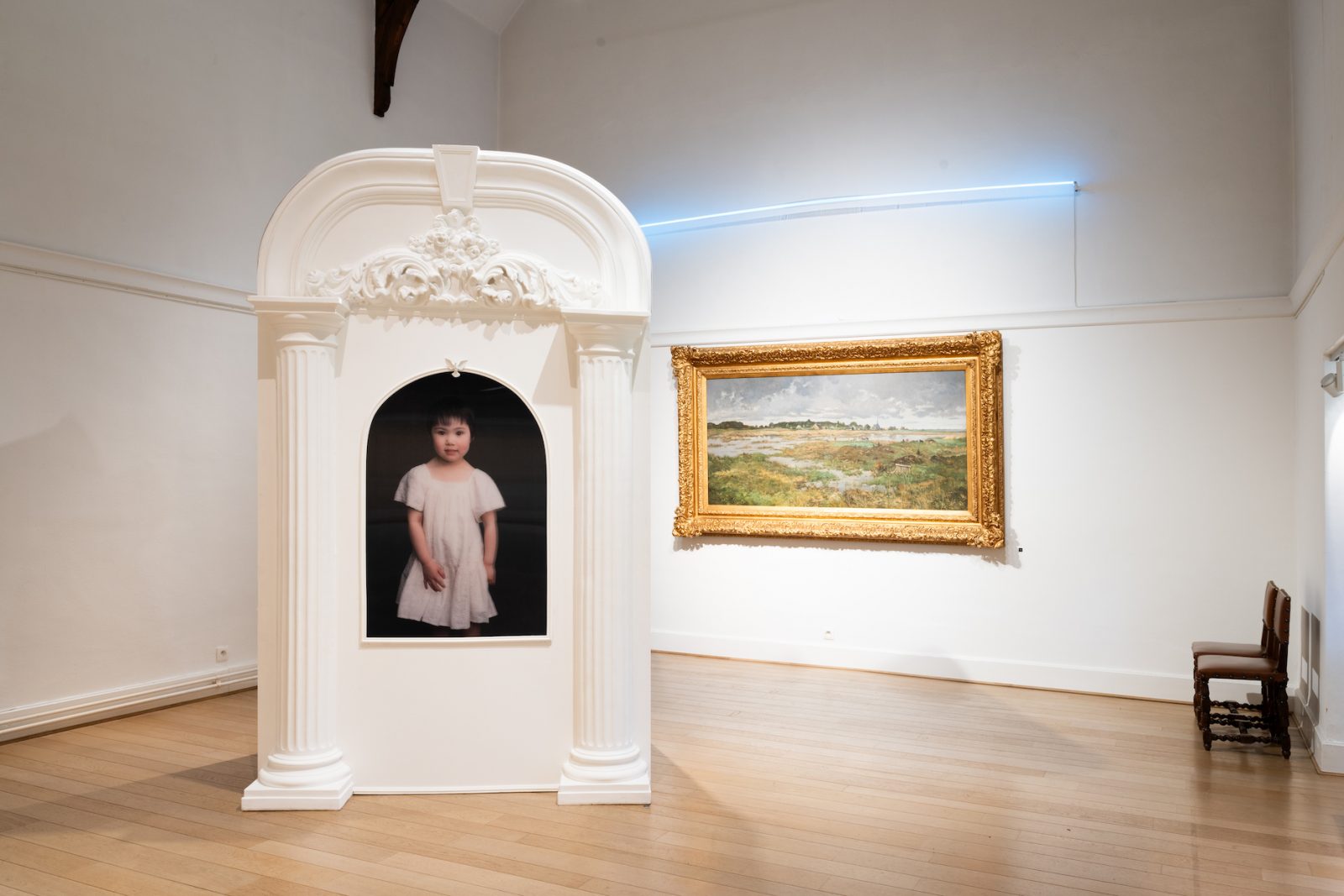 Boven de foto herkennen we een duifje. De installatie die de foto omlijst, wordt gedragen door twee zuilen. ‘Als ik denk aan zuilen’, zegt Mounir, ‘dan denk ik heel vaak aan buitenmuren, die iets dragen, en dat kan heel robuust overkomen, heel zwaar, groot, en dominant, maar dat gevoel heb ik nu niet.’ De zuilen dragen een fronton, met bloemen en bladeren die mij doen denken aan decoraties in barokke paleizen. ‘Er is gewoon heel veel aandacht voor wie nu op dit moment letterlijk in het centrum van de ruimte staat’, ziet Mounir.