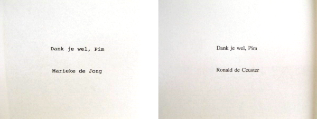 Ook hangen er twee A4’tjes met daarop de doeltreffende tekst ‘Dank je wel, Pim’ en daaronder de namen van Ronald de Ceuster en Marieke de Jong. De dag na de opening ontdekte Pim Trooster de bijbehorende cd in de cd-speler die op de grond naast de dankbetuigingen stond. Op de cd staat een opname, waarin Marieke en Ronald urenlang om en om de woorden ‘Dank je wel Pim’ herhalen.