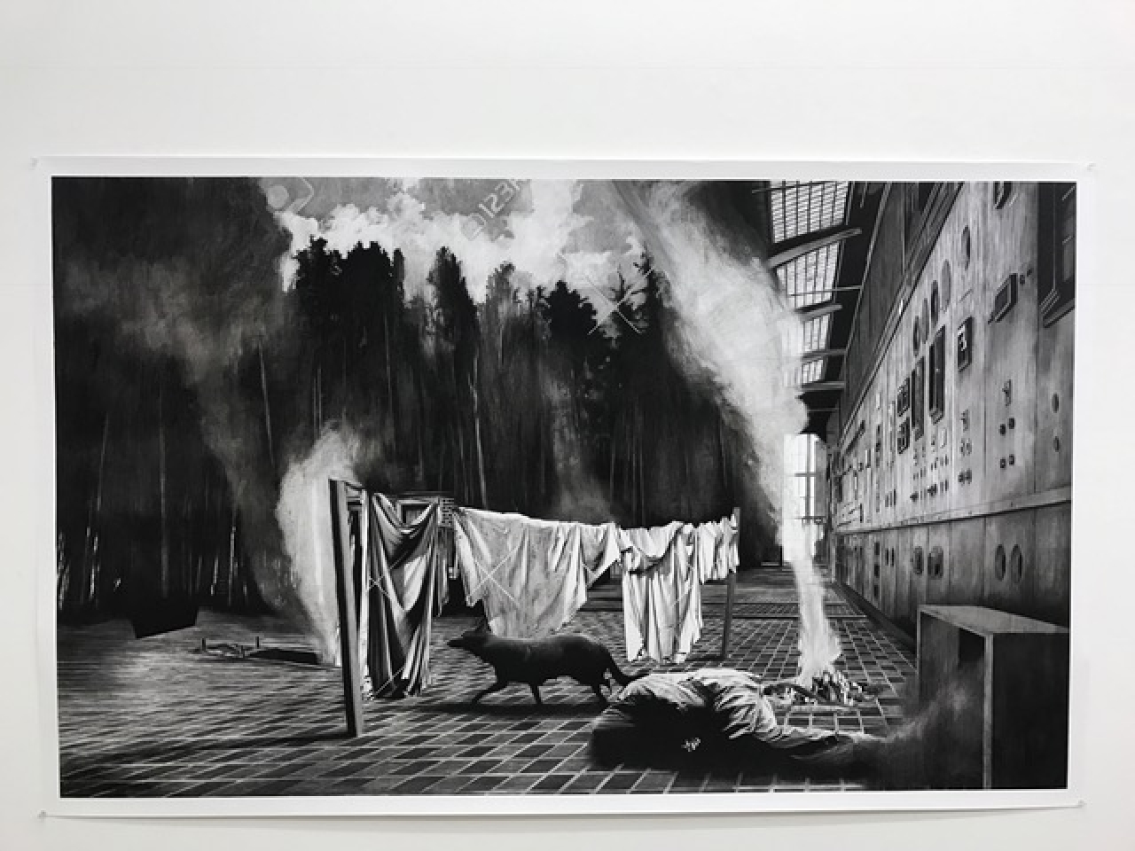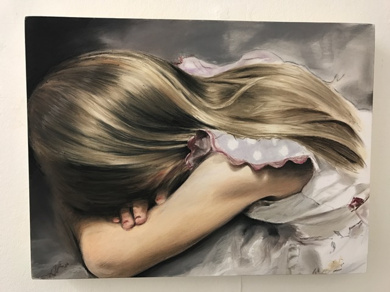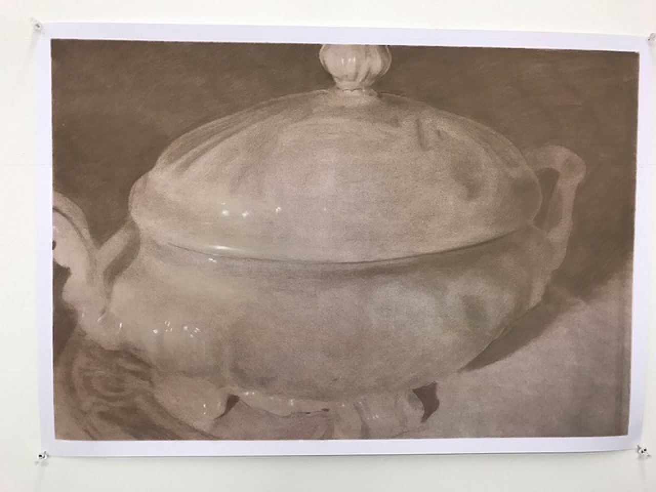 De verwantschap van Bart Gielen met Steven Peters Caraballo is evident. Ook bij Peters Caraballo zien we een zelden vertoond vakmanschap, met name als het gaat om de beheersing van pastelkrijt. Hij omschrijft zijn werk zelf niet eens als tekeningen. Hij past het materiaal zo toe dat hij eerder schildert met krijt. Bij hem is het coloriet dan ook van groot belang. Zijn geschilderde tekeningen van onder meer porseleinen voorwerpen zijn zo tastbaar dat de kunstmatige schijn der dingen waarachtiger aandoet dan de werkelijkheid. Zijn pronkstuk op de tentoonstelling is een groot werk waar een 19de eeuwse jurk een onbeschaamde seksualiteit kenbaar maakt: dat iets wat zo ten dienste staat van de verhulling van het lichaam dusdanig kan functioneren is een onverklaarbaar raadsel. Daar komt bij dat de geteken-schilderde jurk niet eens een vrouw bevat. Het lichaam is uit de jurk getekend. Net als bij Gielen is hier wat we niet kunnen zien doorslaggevend voor onze perceptie van het werk.