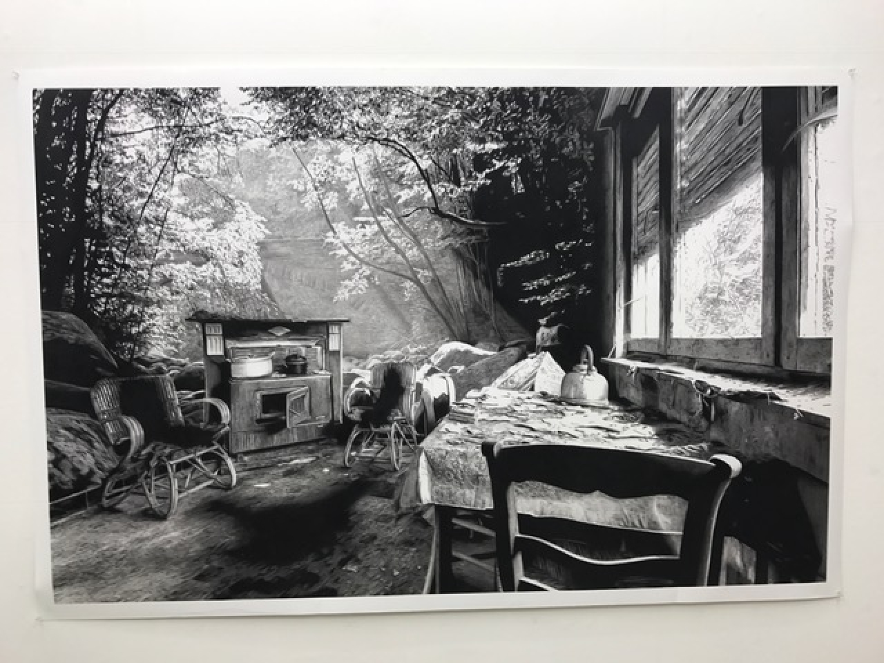 De tentoonstellingsruimte in Schoutenstraat 10 is relatief bescheiden, maar de presentaties zijn er altijd effectief. Opvallend aan het werk van Peters Caraballo en Gielen is dat het uitblinkt door de technische materiaalbeheersing die volkomen ondergeschikt is aan de inhoudelijke kwaliteit van persoonlijke verbeeldingskracht. De soms zeer grote tekeningen in zwart-wit van Bart Gielen veroveren je meteen door hun indrukwekkende ambachtelijkheid. Het illusionaire realisme is in tegenspraak met de onmogelijkheden die het werk herbergt. Er is uiteindelijk misschien wel meer niet getekend dan wel, en toch is dat niet getekende wat de overhand heeft als de kwaliteit van de tekening. Daardoor ontstaat er bij langduriger kijken een steeds grotere ongemakkelijkheid bij het nagaan van wat je nu echt ziet. Er is iets verontrustend in het werk wat je tegelijkertijd ook geruststelt. Die ambivalentie in het werk is confronterend, waardoor je je staand tegenover zo’n tekening afvraagt waar je eigenlijk bent. Ruimte, tijd en plaats in de tekening zijn zo onbestemd dat die je onzeker maken over je eigen positie. Landschappelijkheid en huiselijke interieurs vloeien bij Gielen in elkaar over zonder dat je direct in de gaten hebt. De tactiele stoffelijkheid van al het getekende maakt zo’n indruk dat je eerst vergeet dat die artificieel is om vervolgens opgelucht te accepteren dat wat de realiteit ons onthoudt in de verbeelding van de kunstenaar wel wordt toegestaan.