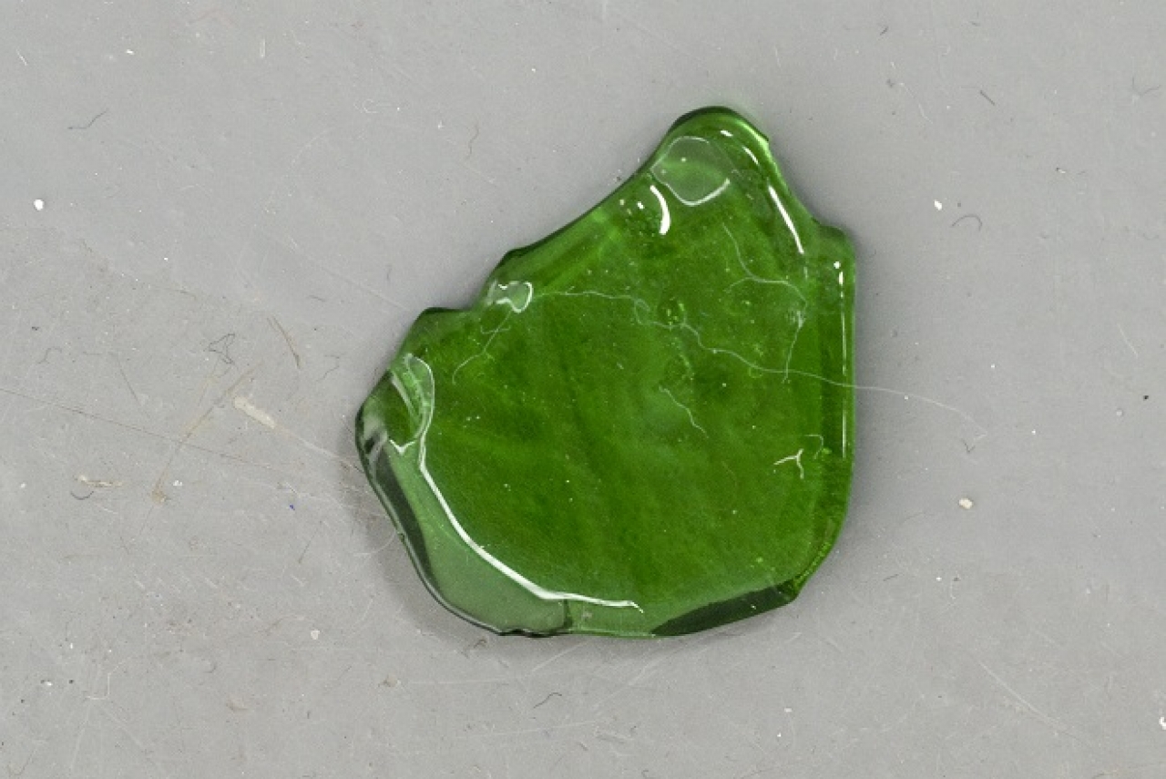 Het werk wat te zien is op de foto bestaat uit een aantal stukken glas, die afkomstig zijn van een kapot bierflesje. De stukken glas heb ik in de glasoven gedaan, waardoor de randen die eerst scherp waren afgerond zijn. Het smeltproces is binnen de perken gebleven waardoor aan de bovenzijde de oorspronkelijke vorm nog steeds herkenbaar is. Je kunt nog altijd zien dat een stuk glas bijvoorbeeld afkomstig is van de schroefdraad van een fles. In dit werk bepaald de werking van het materiaal de uiteindelijke vorm van het object. Mijn werken zijn dan ook vaak materiaalgericht, waarbij ik gebruik maak van de kwaliteiten van het materiaal zelf. Ik onderzoek hoever ik kan gaan in het vormen van het object, wat nog zichtbaar en gematerialiseerd moet worden.